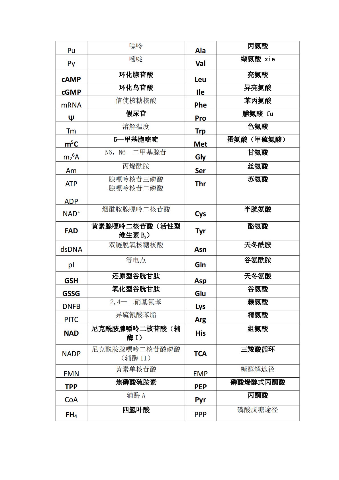 Pu嘌呤Ala丙氨酸Py嘧啶Val缬氨酸xiecAMP环化腺苷酸Leu亮氨酸cGMP环化鸟苷酸Ile异亮氨酸mRNA信使核糖核酸Phe苯丙氨酸Ψ假尿苷Pro脯氨酸fuTm溶解温度Trp色氨酸m5C5—甲基胞嘧啶Met蛋氨酸(甲硫氨酸)m26AN6,N6—二甲基腺苷Gly甘氨酸Am丙烯酰胺Ser丝氨酸ATPADP腺嘌呤核苷三磷酸腺嘌呤核苷二磷酸Thr苏氨酸NAD+烟酰胺腺嘌呤二核苷酸Cys半胱氨酸FAD黄素腺嘌呤二核苷酸(活性型维生素B2)Tyr酪氨酸dsDNA双链脱氧核糖核酸Asn天冬酰胺pI等电点Gln谷氨酰胺GSH还原型谷胱甘肽Asp天冬氨酸GSSG氧化型谷胱甘肽Glu谷氨酸DNFB2,4...