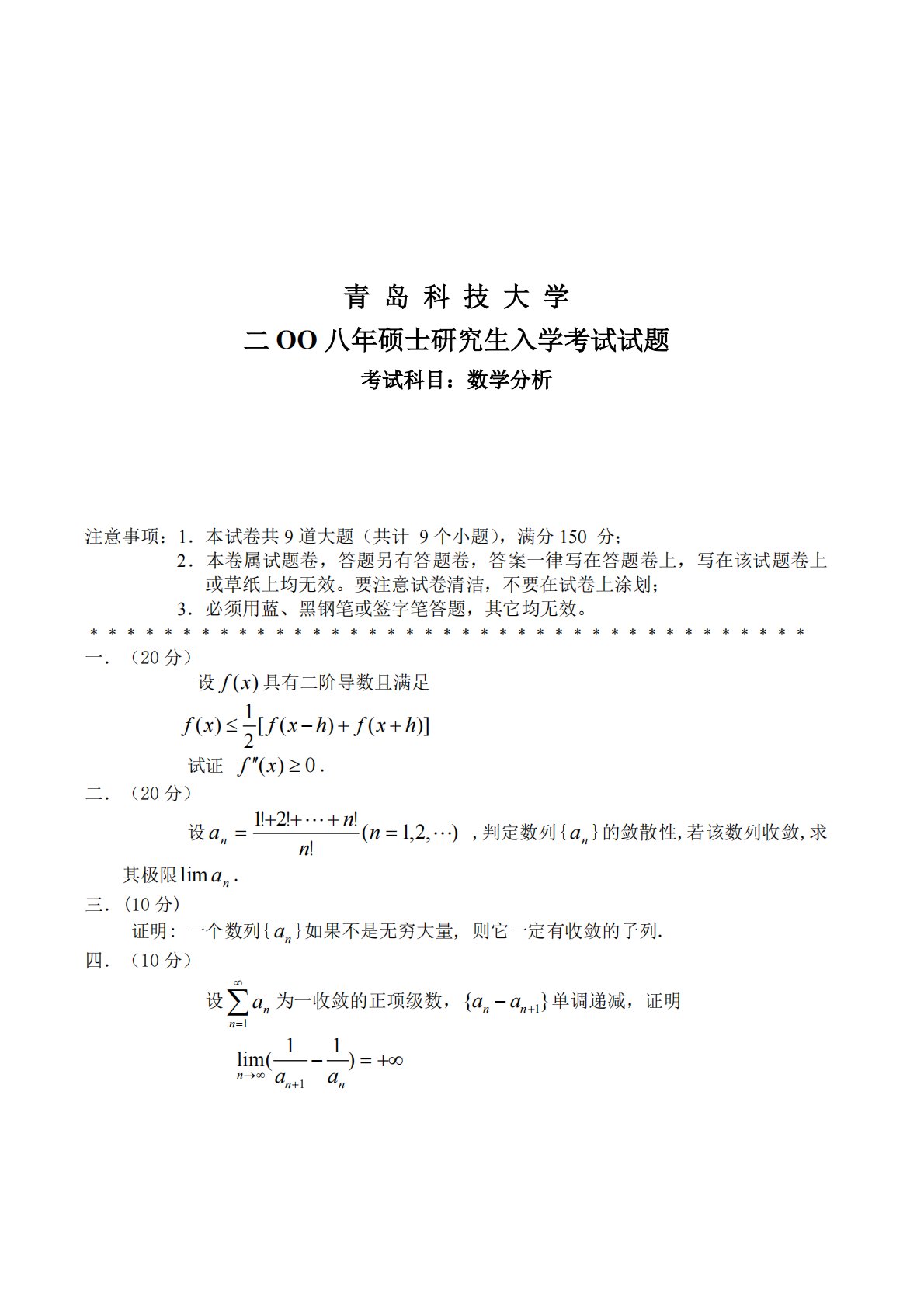 注意事项:1.本试卷共9道大题(共计9个小题),满分150青岛科技大学二OO八年硕士研究生入学考试试题考试科目:数学分析分;2.本卷属试题卷,答题另有答题卷,答案一律写在答题卷上,写在该试题卷上或草纸上均无效。要注意试卷清洁,不要在试卷上涂划;3.必须用蓝、黑钢笔或签字笔答题,其它均无效。﹡﹡﹡﹡﹡﹡﹡﹡﹡﹡﹡﹡﹡﹡﹡﹡﹡﹡﹡﹡﹡﹡﹡﹡﹡﹡﹡﹡﹡﹡﹡﹡﹡﹡﹡﹡﹡﹡﹡一.(20分)设f(x)具有二阶导数且满足1f(x)2[f(xh)f(xh)]试证f(x)0.二.(20分)!1!2!nn!设an(n1,2,),判定数列{an}的敛散性,若该数列收敛,求其极限liman...