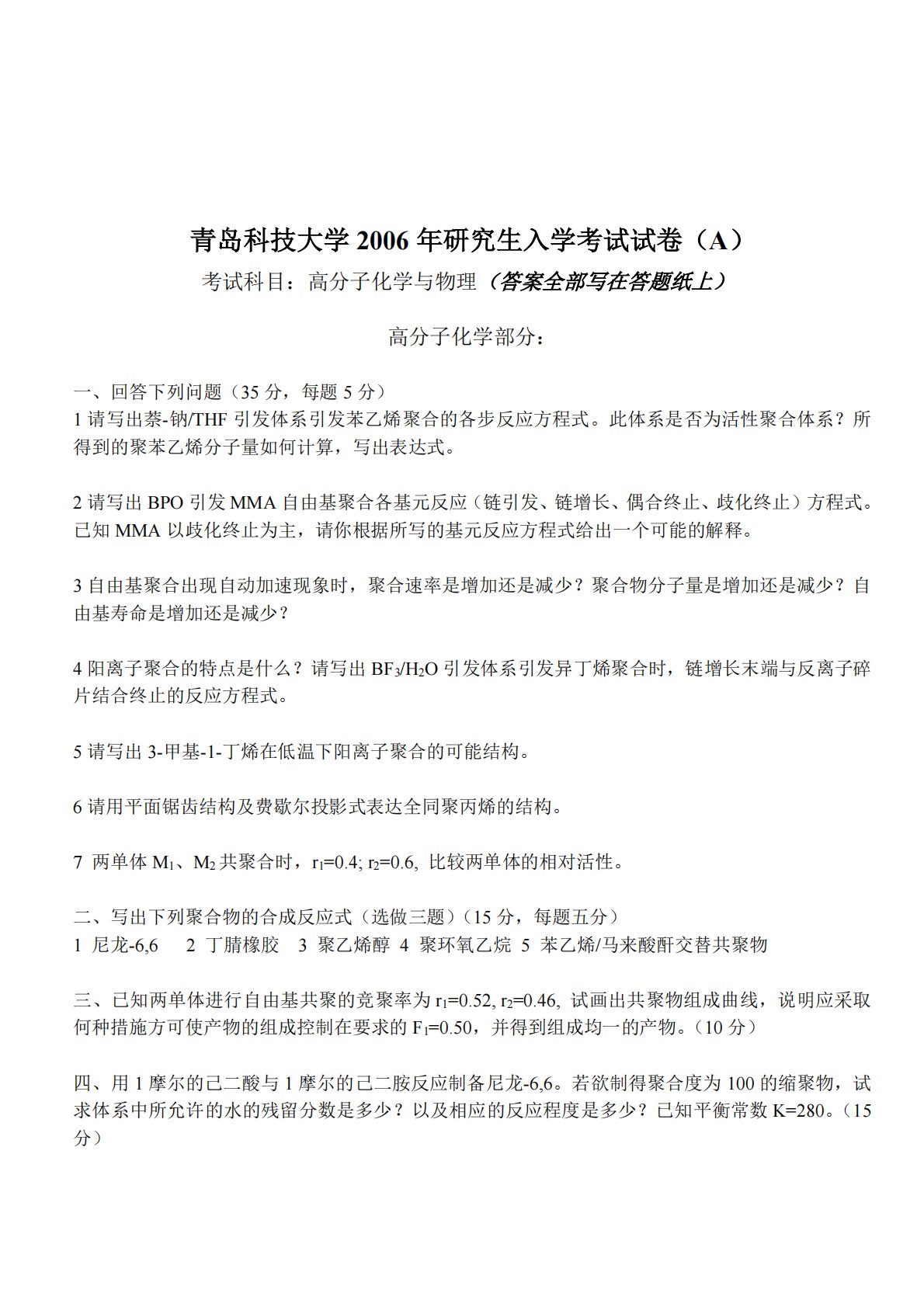 青岛科技大学2006年研究生入学考试试卷(A)考试科目:高分子化学与物理(答案全部写在答题纸上)高分子化学部分:一、回答下列问题(35分,每题5分)1请写出萘-钠/THF引发体系引发苯乙烯聚合的各步反应方程式。此体系是否为活性聚合体系?所得到的聚苯乙烯分子量如何计算,写出表达式。2请写出BPO引发MMA自由基聚合各基元反应(链引发、链增长、偶合终止、歧化终止)方程式。已知MMA以歧化终止为主,请你根据所写的基元反应方程式给出一个可能的解释。3自由基聚合出现自动加速现象时,聚合速率是增加还是减少?聚合物分子量是增加还是减少?自由基寿命是增加还是减少?4阳离子聚合的特点是什么?请写出BF3/H2O...