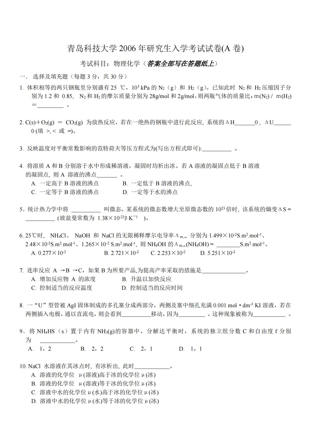 青岛科技大学2006年研究生入学考试试卷(A卷)考试科目:物理化学(答案全部写在答题纸上)一.选择及填充题(每题3分,共30分)1.体积相等的两只钢瓶里分别盛有25℃,103kPa的N2(g)和H2(g)。已知此时N2和H2压缩因子分别为1.2和0.85,N2和H2的摩尔质量分别为28g/mol和2g/mol,则两瓶气体的质量比:m(N2)/m(H2)=。2.C(s)+O2(g)=CO2(g)为放热反应,若在一绝热的钢瓶中进行此反应,系统的ΔH0,ΔU0(填>,<或=)。3.反映温度对平衡常数影响的范特荷夫等压方程式为(写出方程式即可):。4.将溶质A和B分别溶于水中形成稀溶液,凝固时均析出冰...