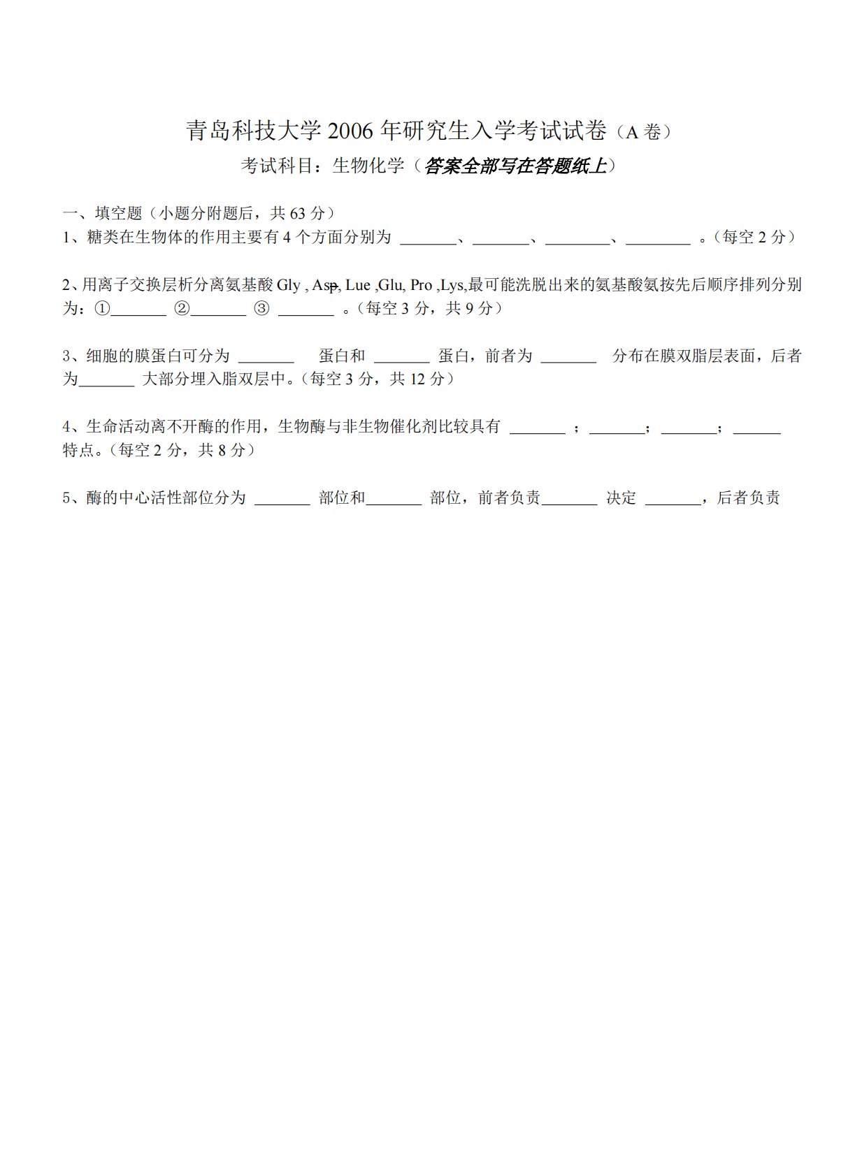 青岛科技大学2006年研究生入学考试试卷(A卷)考试科目:生物化学(答案全部写在答题纸上)一、填空题(小题分附题后,共63分)1、糖类在生物体的作用主要有4个方面分别为、、、。(每空2分)2、用离子交换层析分离氨基酸Gly,Asp,Lue,Glu,Pro,Lys,最可能洗脱出来的氨基酸氨按先后顺序排列分别为:①②③。(每空3分,共9分)3、细胞的膜蛋白可分为蛋白和蛋白,前者为分布在膜双脂层表面,后者为大部分埋入脂双层中。(每空3分,共12分);;;4、生命活动离不开酶的作用,生物酶与非生物催化剂比较具有特点。(每空2分,共8分)5、酶的中心活性部位分为部位和部位,前者负责决定,后者负责青岛科技...