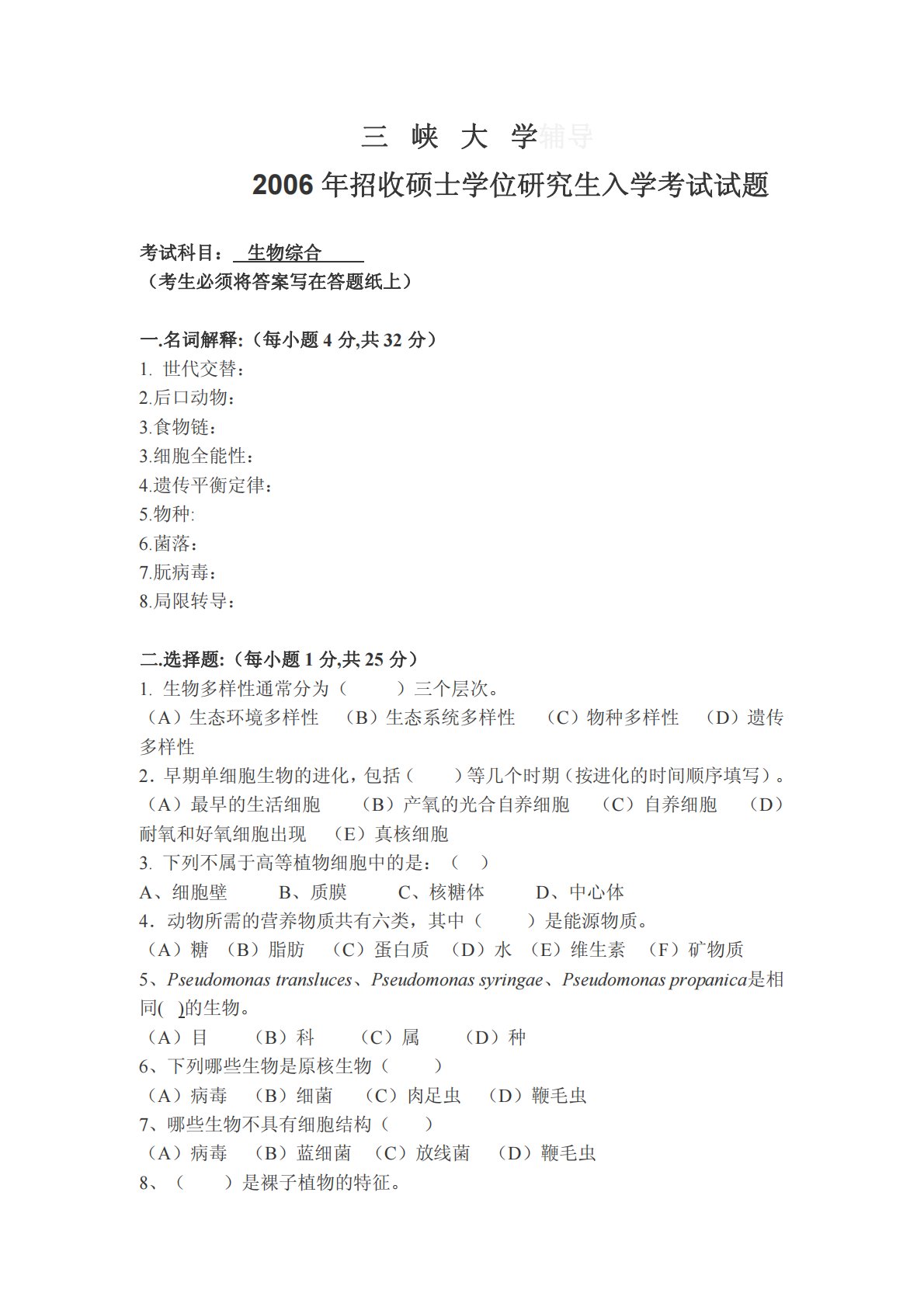 三峡大学辅导2006年招收硕士学位研究生入学考试试题考试科目:生物综合(考生必须将答案写在答题纸上)一.名词解释:(每小题4分,共32分)1.世代交替:2.后口动物:3.食物链:3.细胞全能性:4.遗传平衡定律:5.物种:6.菌落:7.朊病毒:8.局限转导:二.选择题:(每小题1分,共25分)1.生物多样性通常分为()三个层次。(A)生态环境多样性(B)生态系统多样性(C)物种多样性(D)遗传多样性2.早期单细胞生物的进化,包括()等几个时期(按进化的时间顺序填写)。(A)最早的生活细胞(B)产氧的光合自养细胞(C)自养细胞(D)耐氧和好氧细胞出现(E)真核细胞3.下列不属于高等植物细胞中的是...