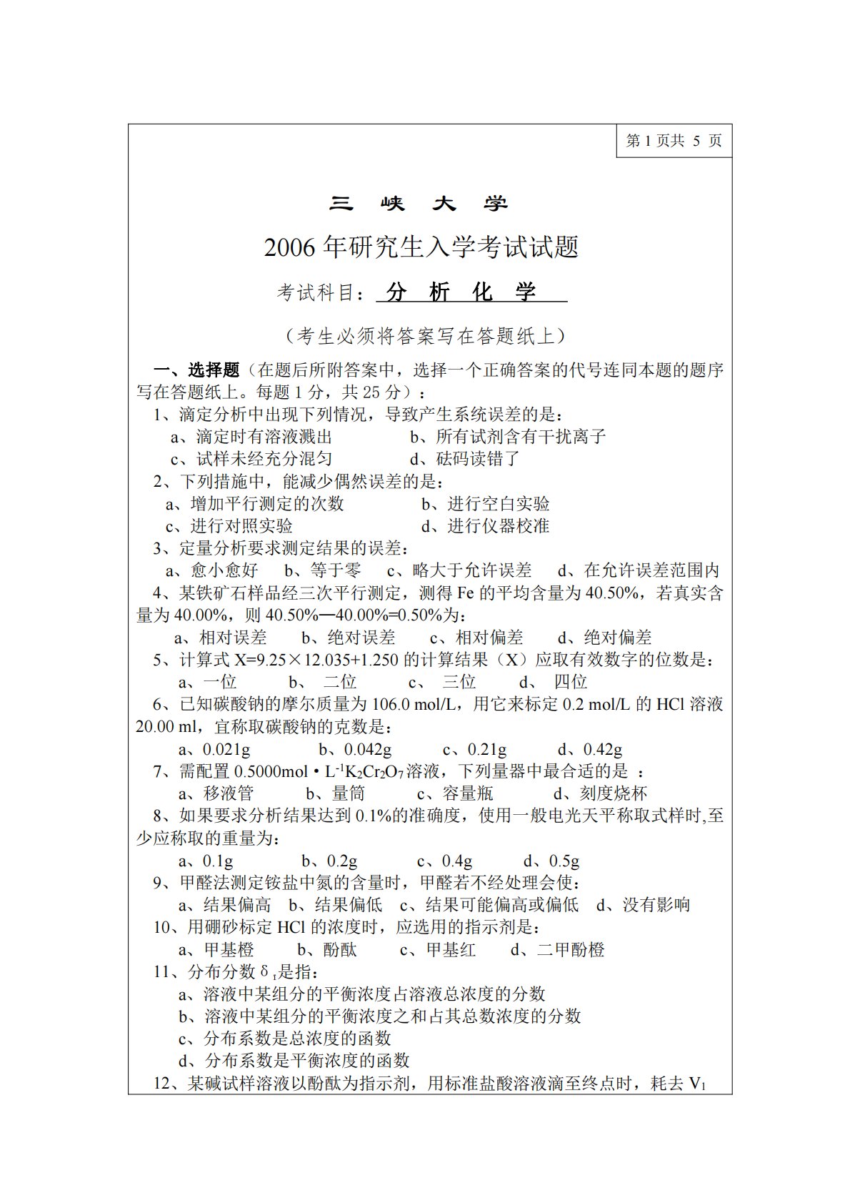 第1页共5页三峡大学2006年研究生入学考试试题考试科目:分析化学(考生必须将答案写在答题纸上)一、选择题(在题后所附答案中,选择一个正确答案的代号连同本题的题序写在答题纸上。每题1分,共25分):1、滴定分析中出现下列情况,导致产生系统误差的是:a、滴定时有溶液溅出b、所有试剂含有干扰离子c、试样未经充分混匀d、砝码读错了2、下列措施中,能减少偶然误差的是:a、增加平行测定的次数b、进行空白实验c、进行对照实验d、进行仪器校准3、定量分析要求测定结果的误差:a、愈小愈好b、等于零c、略大于允许误差d、在允许误差范围内4、某铁矿石样品经三次平行测定,测得Fe的平均含量为40.50%,若真实含量...