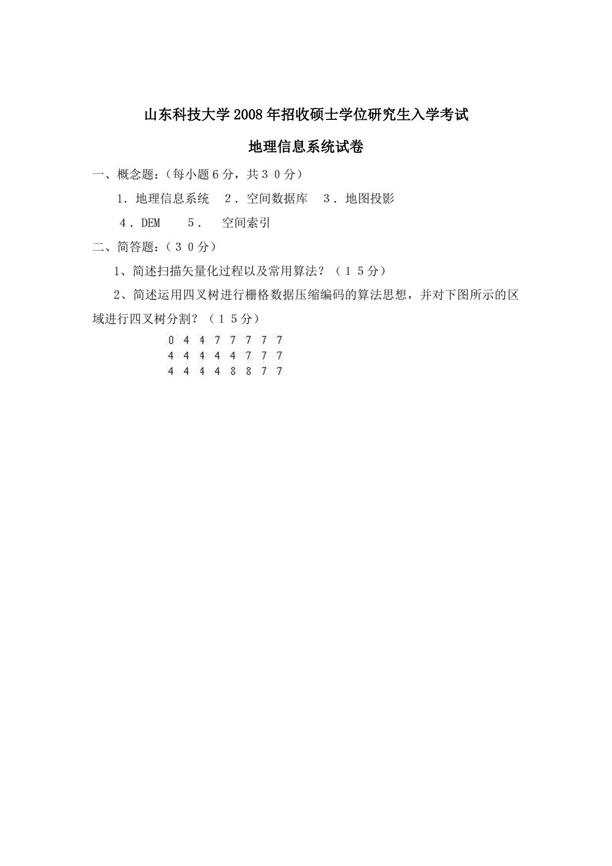 山东科技大学2008年招收硕士学位研究生入学考试地理信息系统试卷一、概念题:(每小题6分,共30分)1.地理信息系统2.空间数据库3.地图投影4.DEM5.空间索引二、简答题:(30分)1、简述扫描矢量化过程以及常用算法?(15分)2、简述运用四叉树进行栅格数据压缩编码的算法思想,并对下图所示的区域进行四叉树分割?(15分)山东科技大学2008年招收硕士学位研究生入学考试地理信息系统试卷一、概念题:(每小题6分,共30分)1.地理信息系统2.空间数据库3.地图投影4.DEM5.空间索引二、简答题:(30分)1、简述扫描矢量化过程以及常用算法?(15分)2、简述运用四叉树进行栅格数据压缩编码的算...