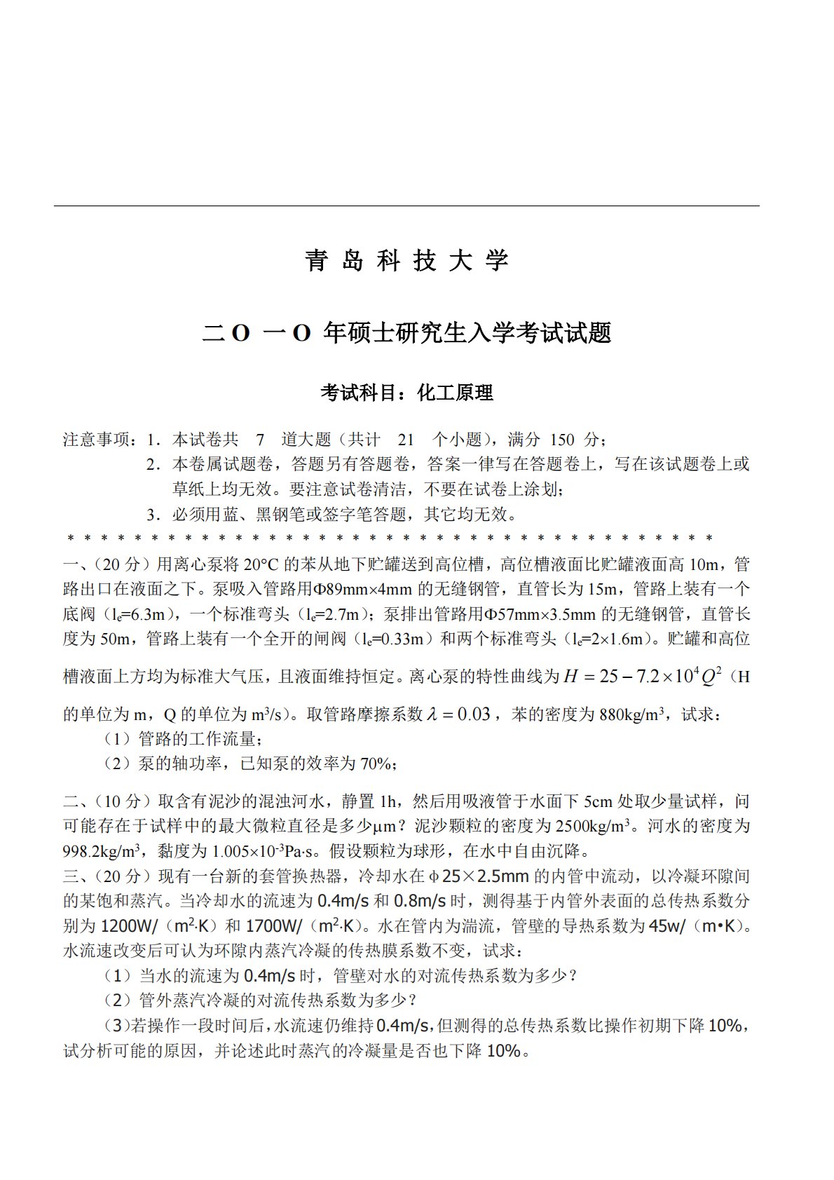 青岛科技大学二O一O年硕士研究生入学考试试题考试科目:化工原理注意事项:1.本试卷共7道大题(共计21个小题),满分150分;2.本卷属试题卷,答题另有答题卷,答案一律写在答题卷上,写在该试题卷上或草纸上均无效。要注意试卷清洁,不要在试卷上涂划;3.必须用蓝、黑钢笔或签字笔答题,其它均无效。﹡﹡﹡﹡﹡﹡﹡﹡﹡﹡﹡﹡﹡﹡﹡﹡﹡﹡﹡﹡﹡﹡﹡﹡﹡﹡﹡﹡﹡﹡﹡﹡﹡﹡﹡﹡﹡﹡﹡一、(20分)用离心泵将20C的苯从地下贮罐送到高位槽,高位槽液面比贮罐液面高10m,管路出口在液面之下。泵吸入管路用89mm4mm的无缝钢管,直管长为15m,管路上装有一个底阀(le=6.3m),一个标准弯头(le=2.7...