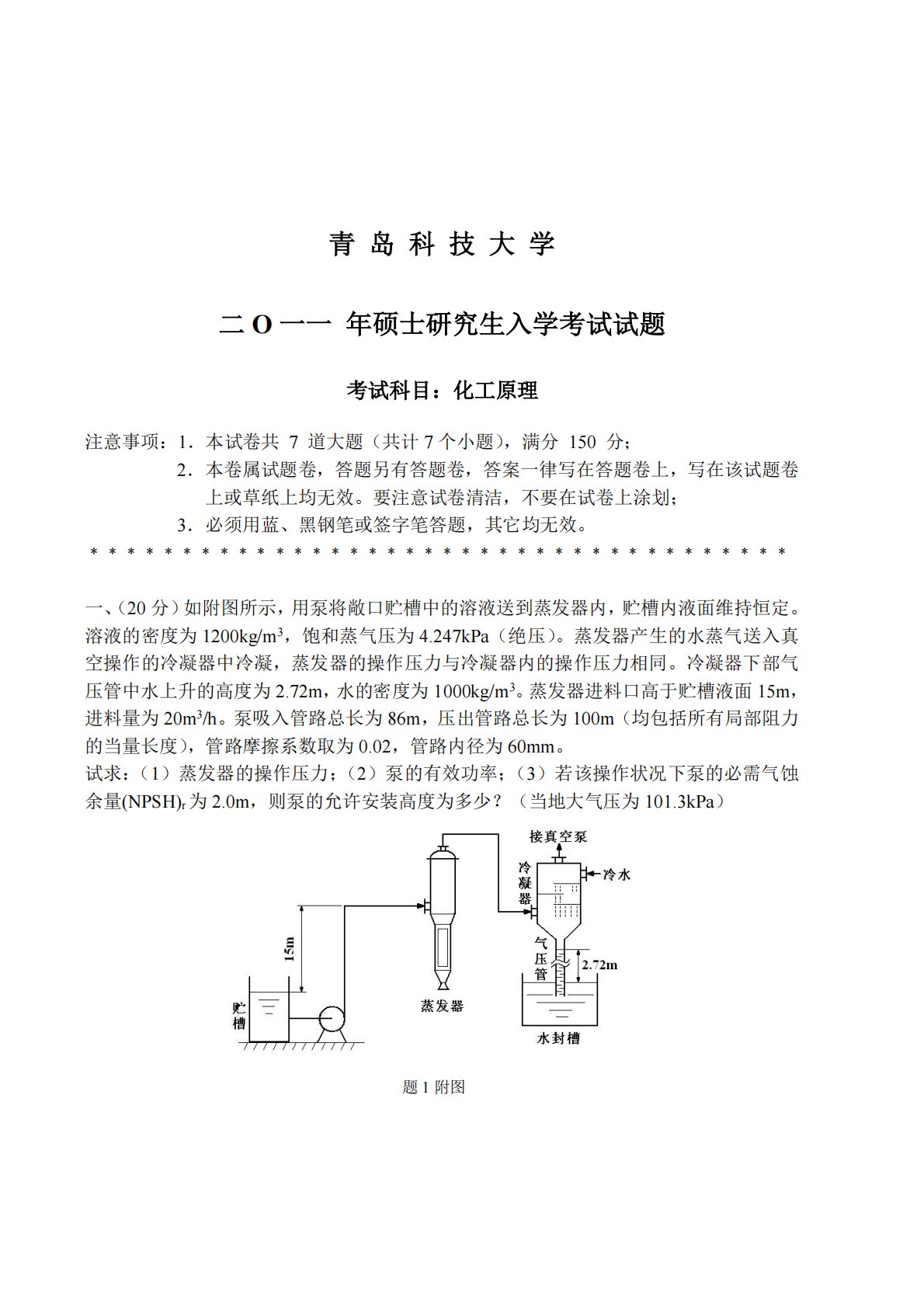 青岛科技大学二O一一年硕士研究生入学考试试题考试科目:化工原理注意事项:1.本试卷共7道大题(共计7个小题),满分150分;2.本卷属试题卷,答题另有答题卷,答案一律写在答题卷上,写在该试题卷上或草纸上均无效。要注意试卷清洁,不要在试卷上涂划;3.必须用蓝、黑钢笔或签字笔答题,其它均无效。﹡﹡﹡﹡﹡﹡﹡﹡﹡﹡﹡﹡﹡﹡﹡﹡﹡﹡﹡﹡﹡﹡﹡﹡﹡﹡﹡﹡﹡﹡﹡﹡﹡﹡﹡﹡﹡﹡一、(20分)如附图所示,用泵将敞口贮槽中的溶液送到蒸发器内,贮槽内液面维持恒定。溶液的密度为1200kg/m3,饱和蒸气压为4.247kPa(绝压)。蒸发器产生的水蒸气送入真空操作的冷凝器中冷凝,蒸发器的操作压力与冷凝器内的操作压力...