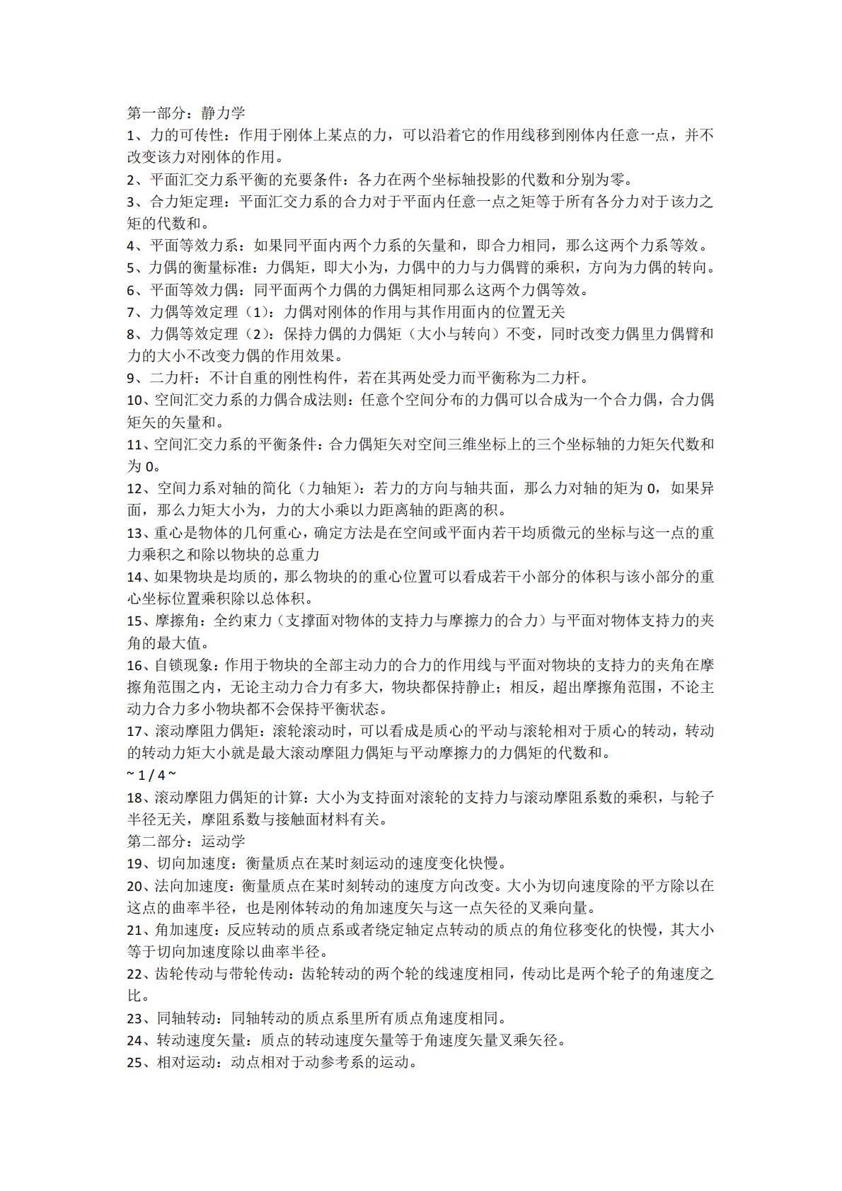 第一部分:静力学1、力的可传性:作用于刚体上某点的力,可以沿着它的作用线移到刚体内任意一点,并不改变该力对刚体的作用。2、平面汇交力系平衡的充要条件:各力在两个坐标轴投影的代数和分别为零。3、合力矩定理:平面汇交力系的合力对于平面内任意一点之矩等于所有各分力对于该力之矩的代数和。4、平面等效力系:如果同平面内两个力系的矢量和,即合力相同,那么这两个力系等效。5、力偶的衡量标准:力偶矩,即大小为,力偶中的力与力偶臂的乘积,方向为力偶的转向。6、平面等效力偶:同平面两个力偶的力偶矩相同那么这两个力偶等效。7、力偶等效定理(1):力偶对刚体的作用与其作用面内的位置无关8、力偶等效定理(2):保持力偶...
