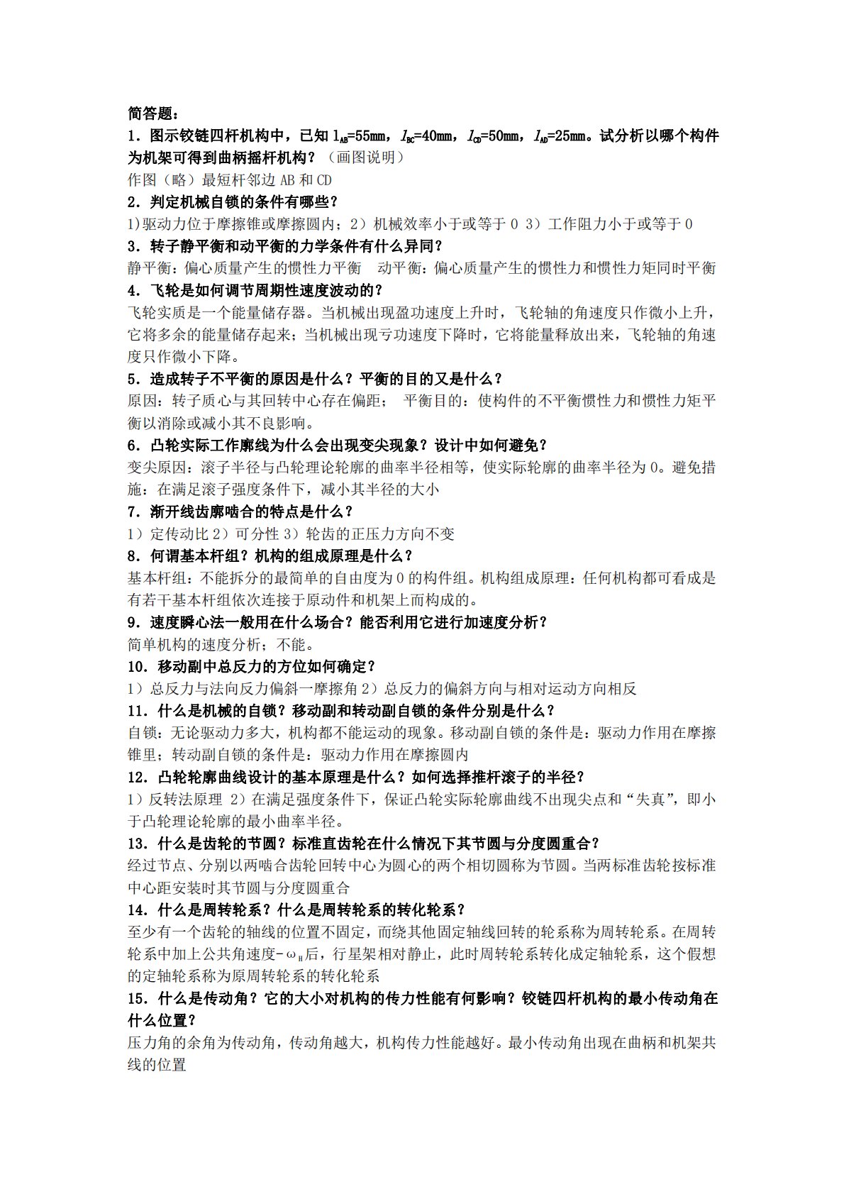 简答题:1.图示铰链四杆机构中,已知lAB=55mm,lBC=40mm,lCD=50mm,lAD=25mm。试分析以哪个构件为机架可得到曲柄摇杆机构?(画图说明)作图(略)最短杆邻边AB和CD2.判定机械自锁的条件有哪些?1)驱动力位于摩擦锥或摩擦圆内;2)机械效率小于或等于03)工作阻力小于或等于03.转子静平衡和动平衡的力学条件有什么异同?静平衡:偏心质量产生的惯性力平衡动平衡:偏心质量产生的惯性力和惯性力矩同时平衡4.飞轮是如何调节周期性速度波动的?飞轮实质是一个能量储存器。当机械出现盈功速度上升时,飞轮轴的角速度只作微小上升,它将多余的能量储存起来;当机械出现亏功速度下降时,它将能量释...