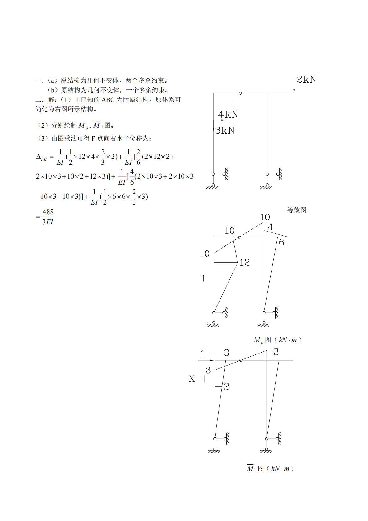 一.(a)原结构为几何不变体,两个多余约束。(b)原结构为几何不变体,一个多余约束。二.解:(1)由已知的ABC为附属结构。原体系可简化为右图所示结构。(2)分别绘制pM,____1M图。(3)由图乘法可得F点向右水平位移为:11212(1242)[(2122236142103102123)][(210321036112103103)](663)234883FHEIEIEIEIEI等效图Mp图(kNm)___M1图(kNm)三.解(1)基本结构如右图所示,11X112X21p0典型方程为:21X12...