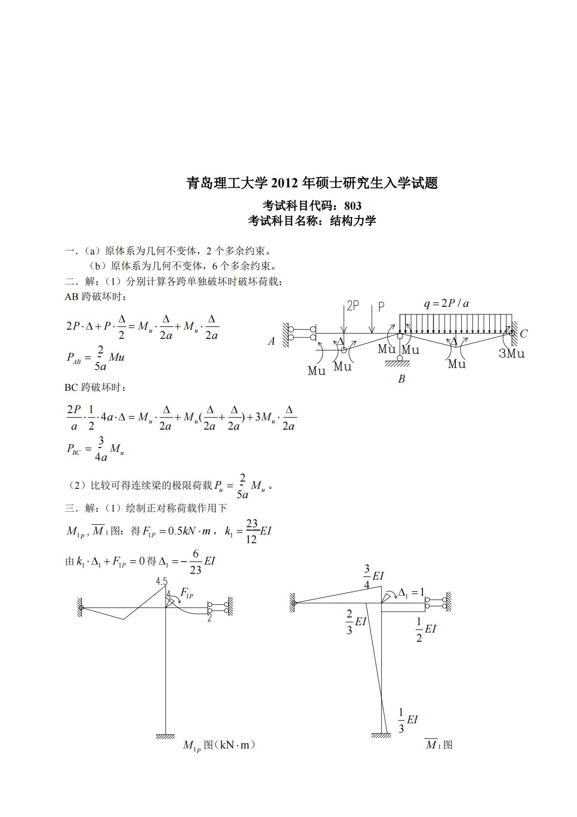 青岛理工大学2012年硕士研究生入学试题考试科目代码:803考试科目名称:结构力学一.(a)原体系为几何不变体,2个多余约束。(b)原体系为几何不变体,6个多余约束。二.解:(1)分别计算各跨单独破坏时破坏荷载:AB跨破坏时:22PPMu2aMu2aPAB52aMuBC跨破坏时:12Pa24aMu2aMu(2a2a)3Mu2aPBC43aMu(2)比较可得连续梁的极限荷载Pu52aMu。三.解:(1)绘制正对称荷载作用下____M1p,M1图:得F1P0.5kNm,k11223EI623EI由k11F1P0得1M1p图...