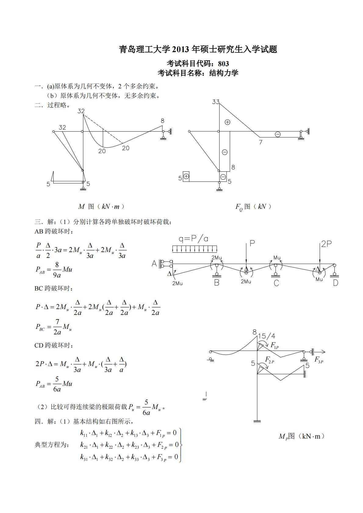 M图(kNm)QF图(kN一.(a)原体系为几何不变体,2青岛理工大学2013年硕士研究生入学试题考试科目代码:803考试科目名称:结构力学个多余约束。(b)原体系为几何不变体,无多余约束。二.过程略。)三.解:(1)分别计算各跨单独破坏时破坏荷载:AB跨破坏时:32223389uuABPaMMaaaPMuaBC跨破坏时:22()222272uuuBCuPMMMaaaaPMaCD跨破坏时:2()3356uuABPMMaaaPMua(2)比较可得连续梁的极限荷载56uuPMa。四.解:(1)基本结构如右图所示,典型方程为:1...