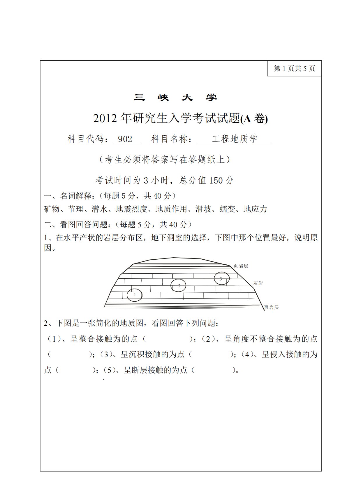 第1页共5页三峡大学2012年研究生入学考试试题(A卷)科目代码:902科目名称:工程地质学(考生必须将答案写在答题纸上)考试时间为3小时,总分值150分一、名词解释:(每题5分,共40分)矿物、节理、潜水、地震烈度、地质作用、滑坡、蠕变、地应力二、看图回答问题:(每题5分,共40分)1、在水平产状的岩层分布区,地下洞室的选择,下图中那个位置最好,说明原因。页岩层页岩层123灰岩2、下图是一张简化的地质图,看图回答下列问题:(1)、呈整合接触为的点();(2)、呈角度不整合接触为的点);(3)、呈沉积接触的为点();(4)、呈侵入接触的为(点();(5)、呈断层接触的为点()。J2O1J1KO...