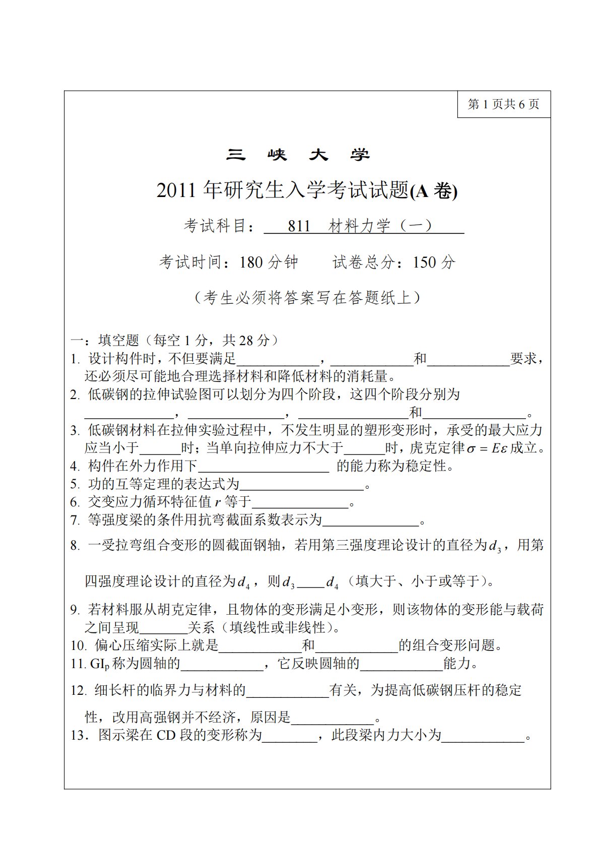 第1页共6页三峡大学2011年研究生入学考试试题(A卷)考试科目:811材料力学(一)考试时间:180分钟试卷总分:150分(考生必须将答案写在答题纸上)一:填空题(每空1分,共28分)1.设计构件时,不但要满足____________,____________和____________要求,还必须尽可能地合理选择材料和降低材料的消耗量。2.低碳钢的拉伸试验图可以划分为四个阶段,这四个阶段分别为,,和。3.低碳钢材料在拉伸实验过程中,不发生明显的塑形变形时,承受的最大应力时;当单向拉伸应力不大于应当小于4.构件在外力作用下时,虎克定律E成立。的能力称为稳定性。。。5.功的互等定理的表达式...