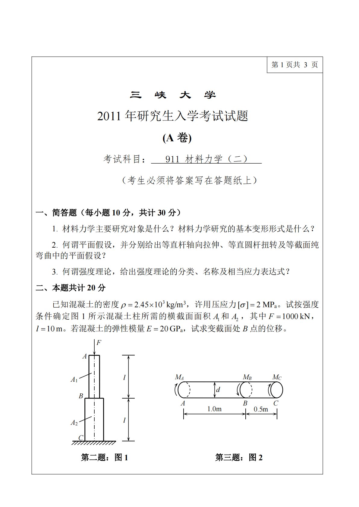 第1页共3页三峡大学2011年研究生入学考试试题(A卷)考试科目:911材料力学(二)(考生必须将答案写在答题纸上)一、简答题(每小题10分,共计30分)1.材料力学主要研究对象是什么?材料力学研究的基本变形形式是什么?2.何谓平面假设,并分别给出等直杆轴向拉伸、等直圆杆扭转及等截面纯弯曲中的平面假设?3.何谓强度理论,给出强度理论的分类、名称及相当应力表达式?二、本题共计20分已知混凝土的密度2.45103kg/m3,许用压应力[]2MPa。试按强度条件确定图1所示混凝土柱所需的横截面面积A1和A2,其中F1000kN,l10m。若混凝土的弹性模量E20GPa,试求变截面处B...