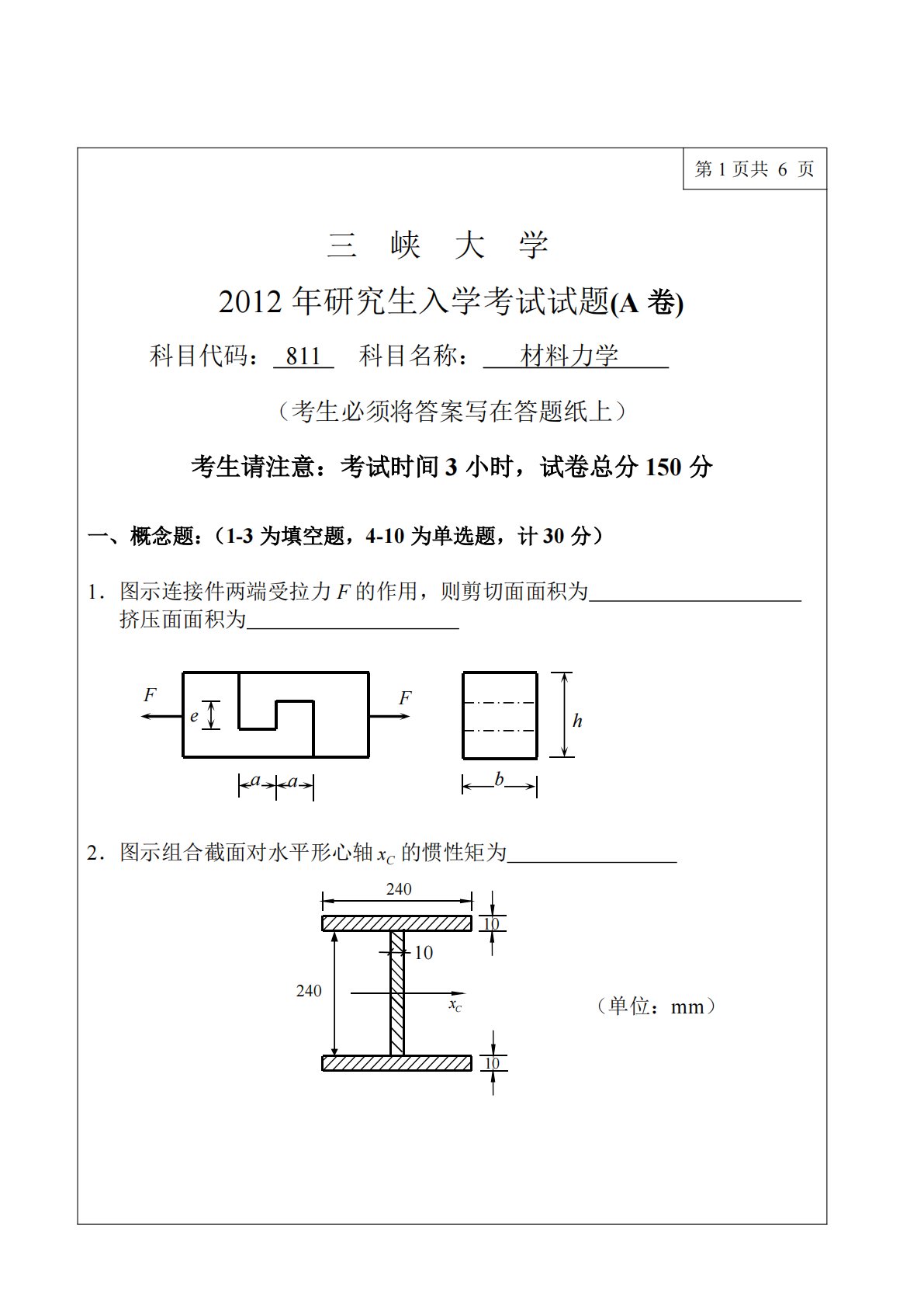 第1页共6页三峡大学2012年研究生入学考试试题(A卷)科目代码:811科目名称:材料力学(考生必须将答案写在答题纸上)考生请注意:考试时间3小时,试卷总分150分一、概念题:(1-3为填空题,4-10为单选题,计30分)1.图示连接件两端受拉力F的作用,则剪切面面积为挤压面面积为FFeaabh2.图示组合截面对水平形心轴xC的惯性矩为(单位:mm)xC240101024010第2页3.图示单元体主应力和最大剪应力分别为(单位MPa)1=2=max=4、一等直杆如图所示,在外力F作用下__________AC截面a的轴力最大截面c的轴力最大BD截面b的轴力最大三个截面上轴力一样大Fcba...