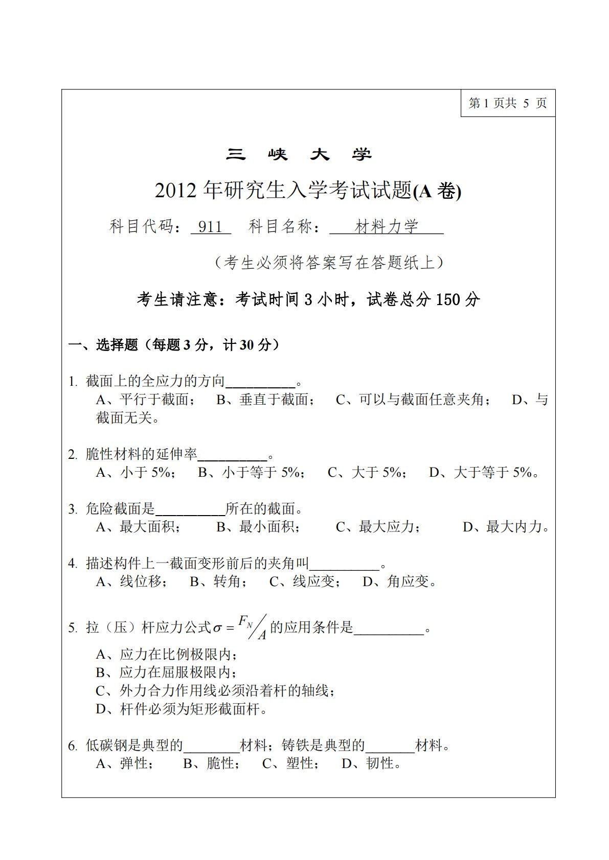 第1页共5页三峡大学2012年研究生入学考试试题(A卷)科目代码:911科目名称:材料力学(考生必须将答案写在答题纸上)考生请注意:考试时间3小时,试卷总分150分一、选择题(每题3分,计30分)1.截面上的全应力的方向__________。A、平行于截面;B、垂直于截面;C、可以与截面任意夹角;D、与截面无关。2.脆性材料的延伸率__________。A、小于5%;B、小于等于5%;C、大于5%;D、大于等于5%。3.危险截面是__________所在的截面。A、最大面积;B、最小面积;C、最大应力;D、最大内力。4.描述构件上一截面变形前后的夹角叫__________。A、线位移;B、转角...