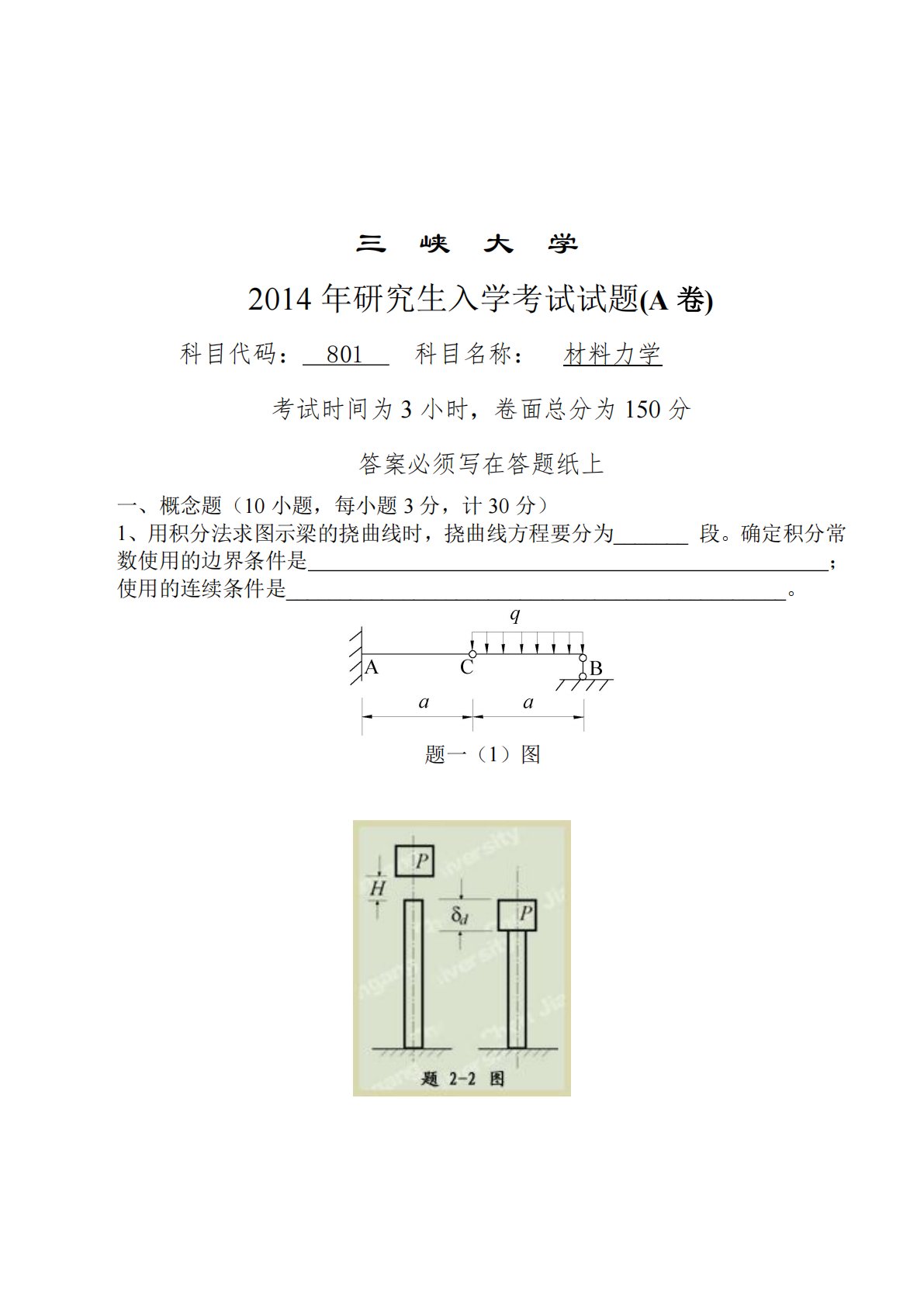 三峡大学2014年研究生入学考试试题(A卷)科目代码:801科目名称:材料力学考试时间为3小时,卷面总分为150分答案必须写在答题纸上一、概念题(10小题,每小题3分,计30分)1、用积分法求图示梁的挠曲线时,挠曲线方程要分为_______段。确定积分常;数使用的边界条件是使用的连续条件是_______________________________________________。题一(1)图2、钢制直杆受轴向力作用,横截面上的正应力超过了材料的屈服极限,此时轴向线应变为1,现在开始卸载,拉力全部卸掉后,轴向残余应变为2。该钢材的弹性模量E=。3、微元体应力状态如图示,其所对应的应力圆...