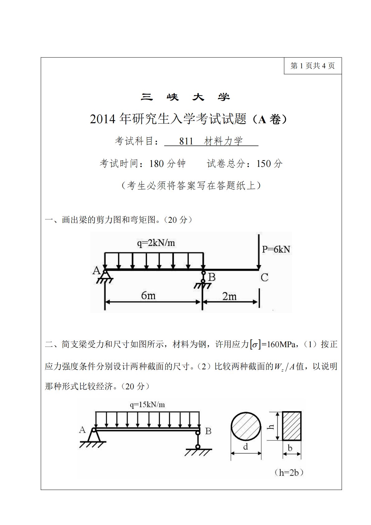 三峡大学811材料力学2014年真题1