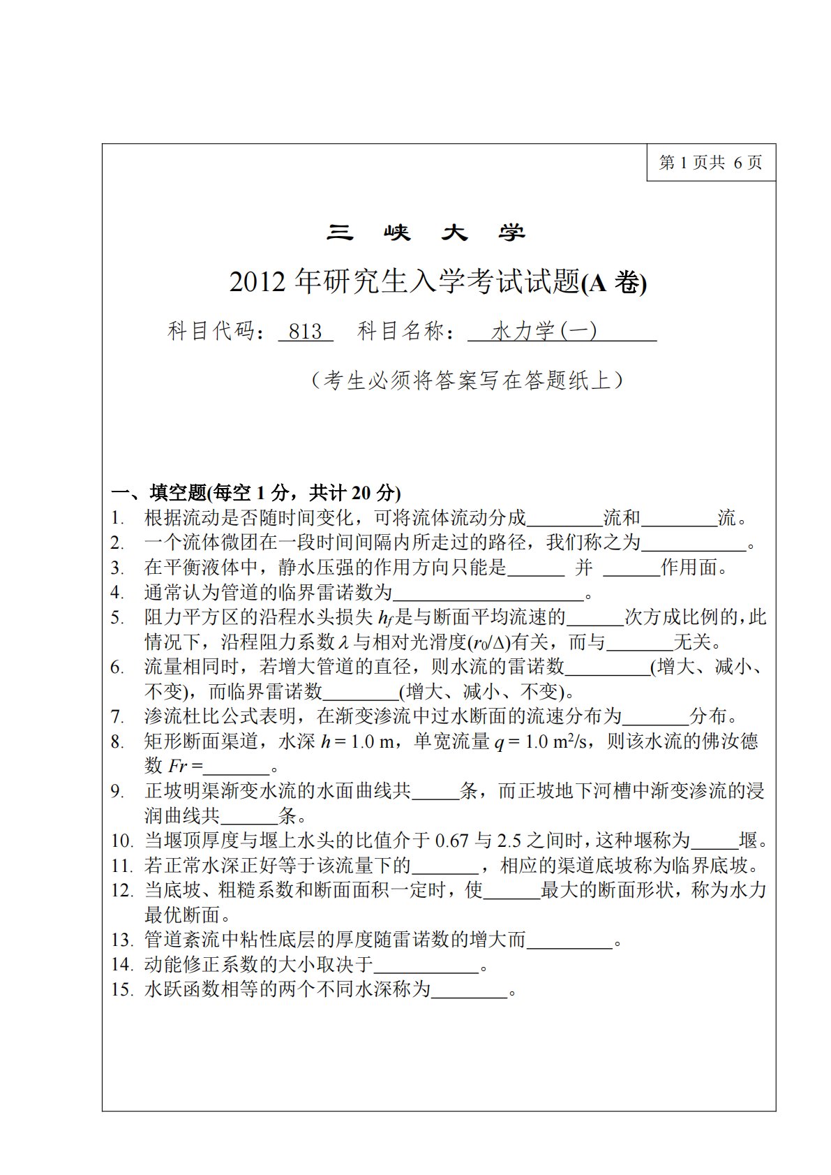 第1页共6页三峡大学2012年研究生入学考试试题(A卷)科目代码:813科目名称:水力学(一)(考生必须将答案写在答题纸上)一、填空题(每空1分,共计20分)1.根据流动是否随时间变化,可将流体流动分成流和流。2.一个流体微团在一段时间间隔内所走过的路径,我们称之为。并作用面。。3.在平衡液体中,静水压强的作用方向只能是4.通常认为管道的临界雷诺数为5.阻力平方区的沿程水头损失hf是与断面平均流速的次方成比例的,此无关。情况下,沿程阻力系数与相对光滑度(r0/∆)有关,而与6.流量相同时,若增大管道的直径,则水流的雷诺数(增大、减小、不变),而临界雷诺数(增大、减小、不变)。7.渗流杜比公式...