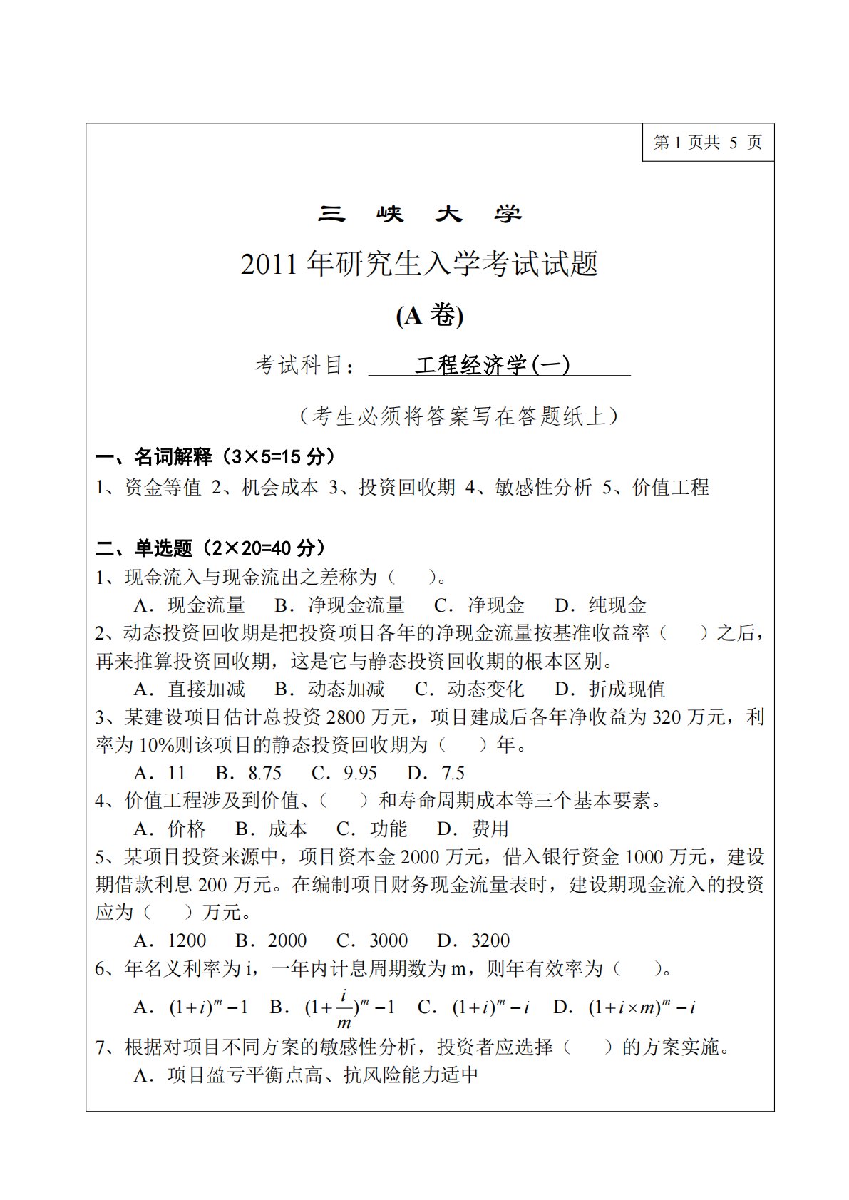 第1页共5页三峡大学2011年研究生入学考试试题(A卷)考试科目:工程经济学(一)(考生必须将答案写在答题纸上)一、名词解释(3×5=15分)1、资金等值2、机会成本3、投资回收期4、敏感性分析5、价值工程二、单选题(2×20=40分)1、现金流入与现金流出之差称为()。A.现金流量B.净现金流量C.净现金D.纯现金)之后,2、动态投资回收期是把投资项目各年的净现金流量按基准收益率(再来推算投资回收期,这是它与静态投资回收期的根本区别。A.直接加减B.动态加减C.动态变化D.折成现值3、某建设项目估计总投资2800万元,项目建成后各年净收益为320万元,利率为10%则该项目的静态投资回收期为(...