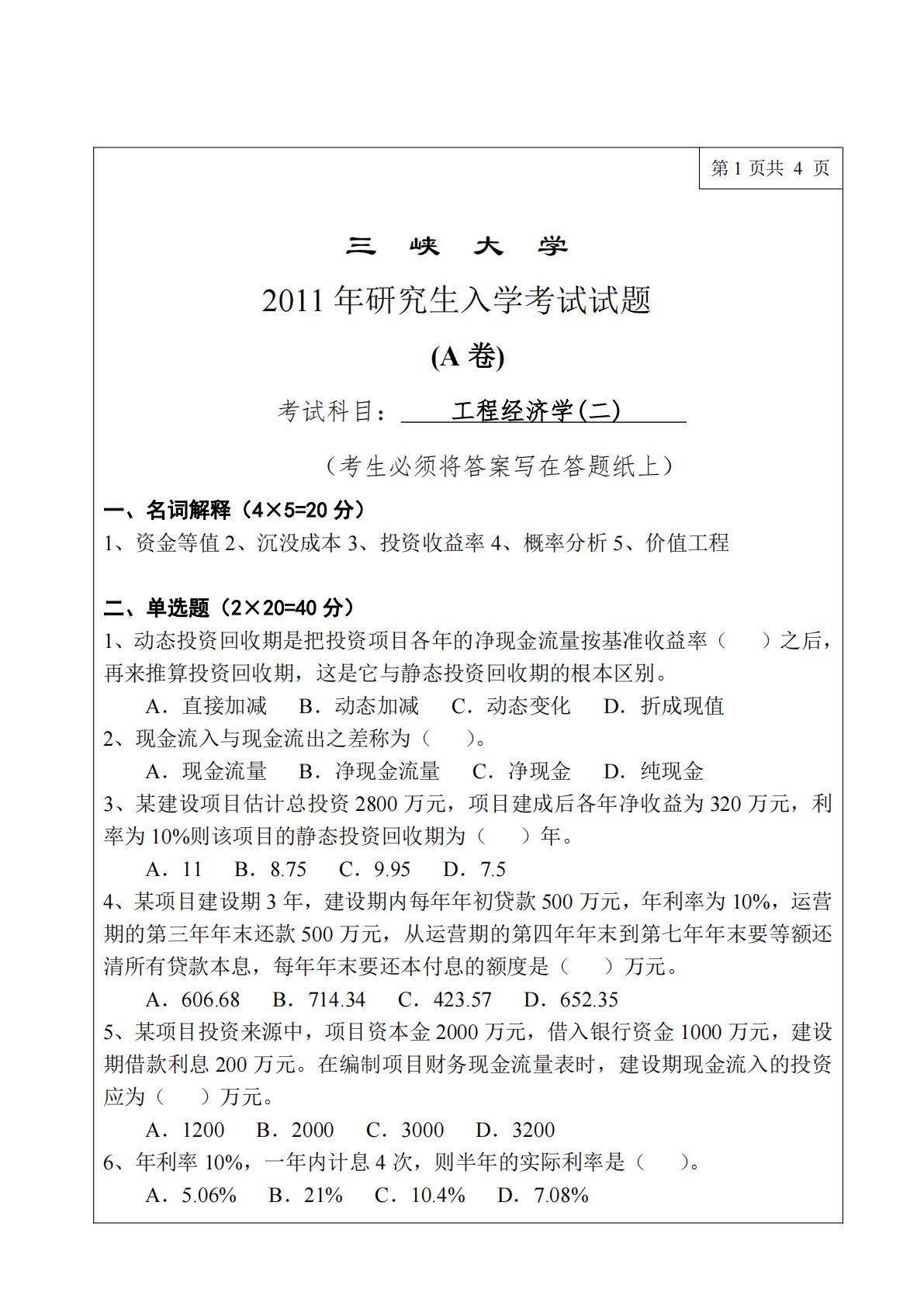 第1页共4页三峡大学2011年研究生入学考试试题(A卷)考试科目:工程经济学(二)(考生必须将答案写在答题纸上)一、名词解释(4×5=20分)1、资金等值2、沉没成本3、投资收益率4、概率分析5、价值工程)之后,二、单选题(2×20=40分)1、动态投资回收期是把投资项目各年的净现金流量按基准收益率(再来推算投资回收期,这是它与静态投资回收期的根本区别。A.直接加减B.动态加减C.动态变化D.折成现值2、现金流入与现金流出之差称为()。A.现金流量B.净现金流量C.净现金D.纯现金3、某建设项目估计总投资2800万元,项目建成后各年净收益为320万元,利率为10%则该项目的静态投资回收期为()...