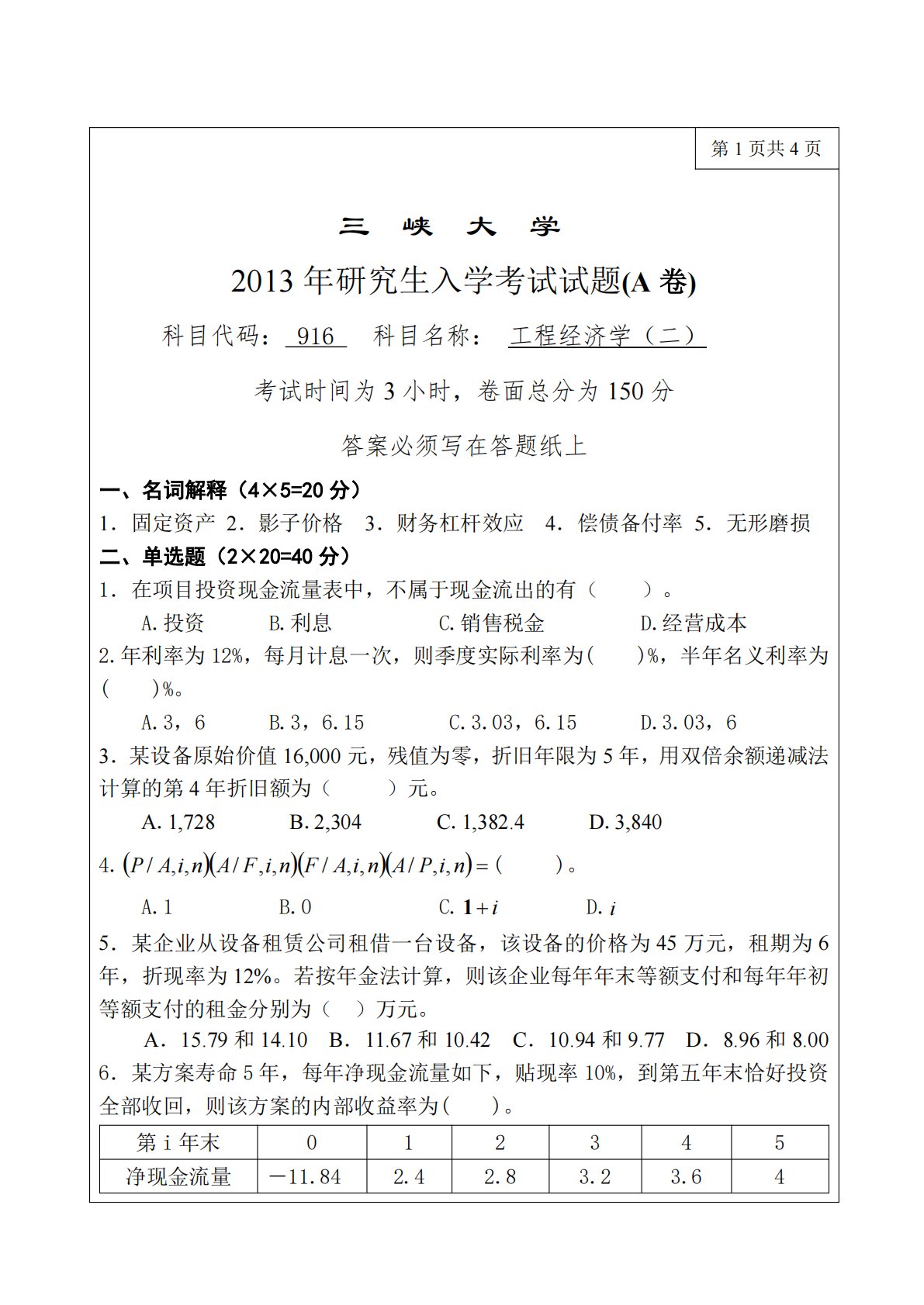 第1页共4页三峡大学2013年研究生入学考试试题(A卷)科目代码:916科目名称:工程经济学(二)考试时间为3小时,卷面总分为150分答案必须写在答题纸上一、名词解释(4×5=20分)1.固定资产2.影子价格3.财务杠杆效应4.偿债备付率5.无形磨损二、单选题(2×20=40分)1.在项目投资现金流量表中,不属于现金流出的有(A.投资B.利息C.销售税金2.年利率为12%,每月计息一次,则季度实际利率为()。D.经营成本)%,半年名义利率为()%。A.3,6B.3,6.15C.3.03,6.15D.3.03,63.某设备原始价值16,000元,残值为零,折旧年限为5年,用双倍余额递减法计算的第...
