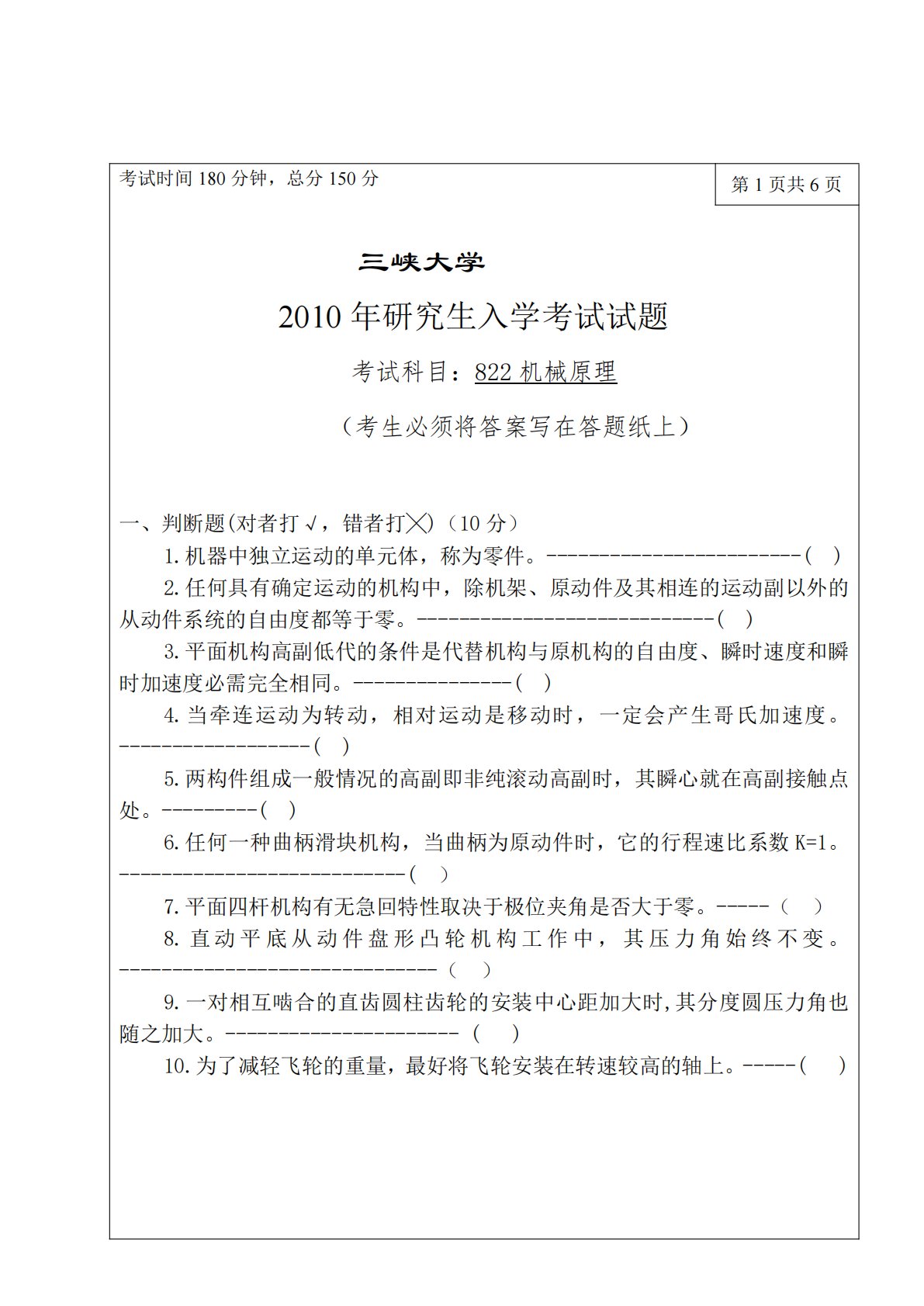 考试时间180分钟,总分150分第1页共6页三峡大学2010年研究生入学考试试题考试科目:822机械原理(考生必须将答案写在答题纸上)一、判断题(对者打√,错者打╳)(10分)1.机器中独立运动的单元体,称为零件。------------------------()2.任何具有确定运动的机构中,除机架、原动件及其相连的运动副以外的从动件系统的自由度都等于零。----------------------------()3.平面机构高副低代的条件是代替机构与原机构的自由度、瞬时速度和瞬时加速度必需完全相同。---------------()4.当牵连运动为转动,相对运动是移动时,一定会产生哥氏加速...