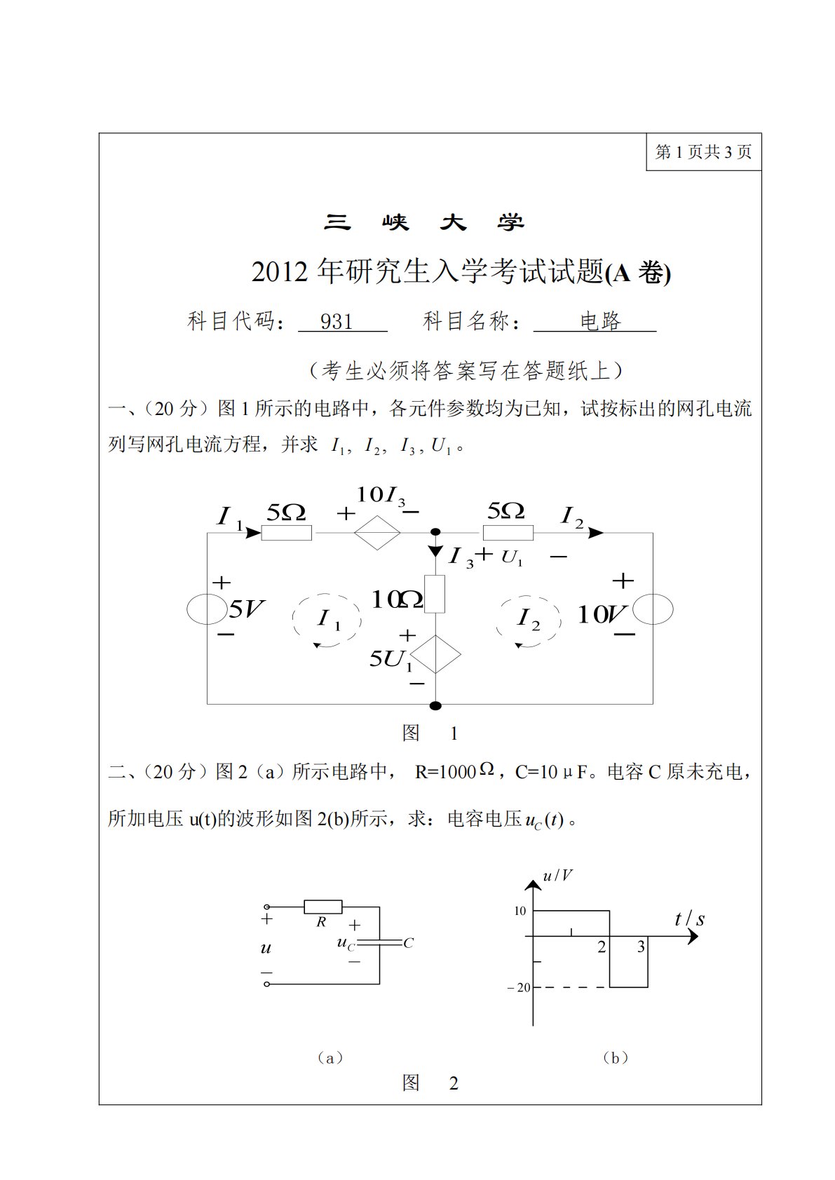 三峡大学831电路2012年真题1