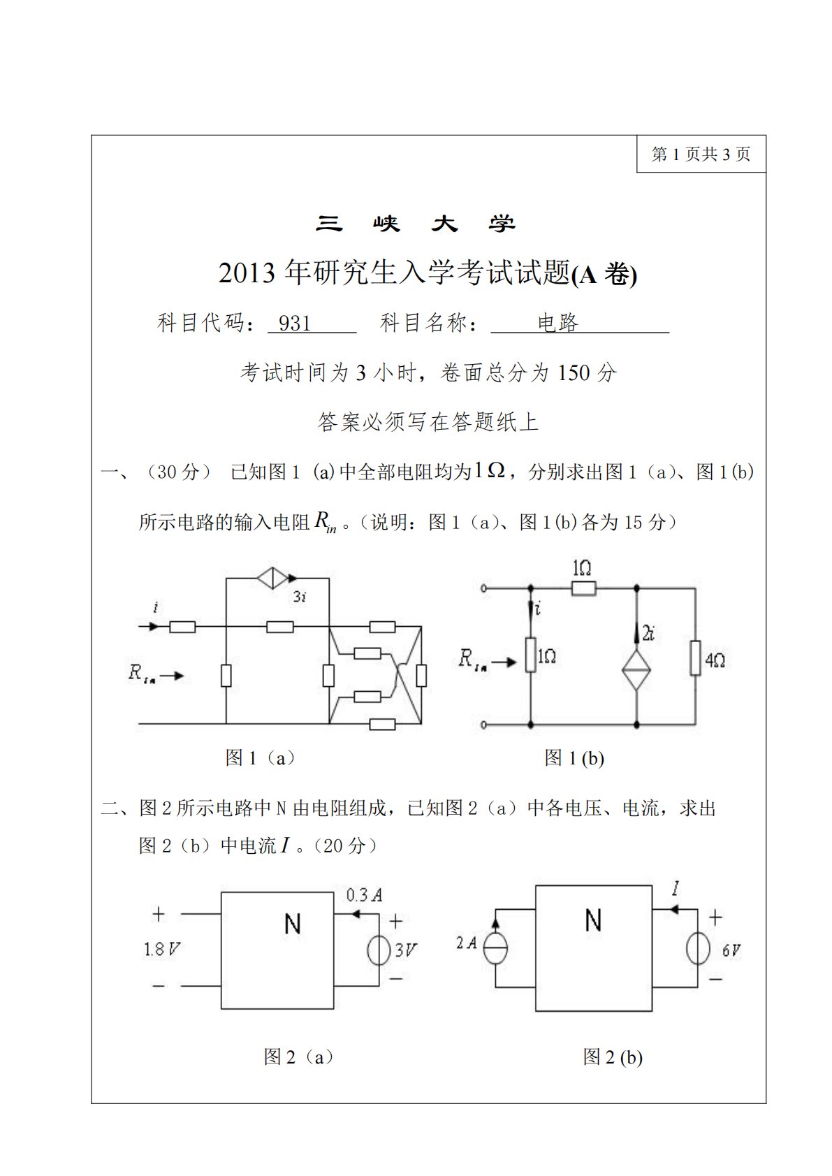 三峡大学831电路2013年真题1