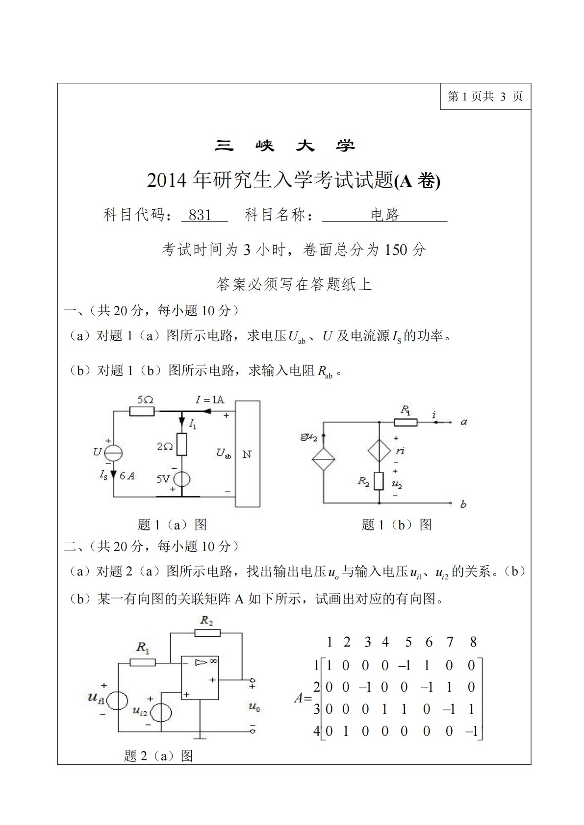 第1页共3页三峡大学2014年研究生入学考试试题(A卷)科目代码:831科目名称:电路考试时间为3小时,卷面总分为150分答案必须写在答题纸上一、(共20分,每小题10分)(a)对题1(a)图所示电路,求电压Uab、U及电流源IS的功率。(b)对题1(b)图所示电路,求输入电阻Rab。题1(b)图题1(a)图二、(共20分,每小题10分)(a)对题2(a)图所示电路,找出输出电压uo与输入电压ui1、ui2的关系。(b)(b)某一有向图的关联矩阵A如下所示,试画出对应的有向图。1234567811130000001101111000110000A240100000...