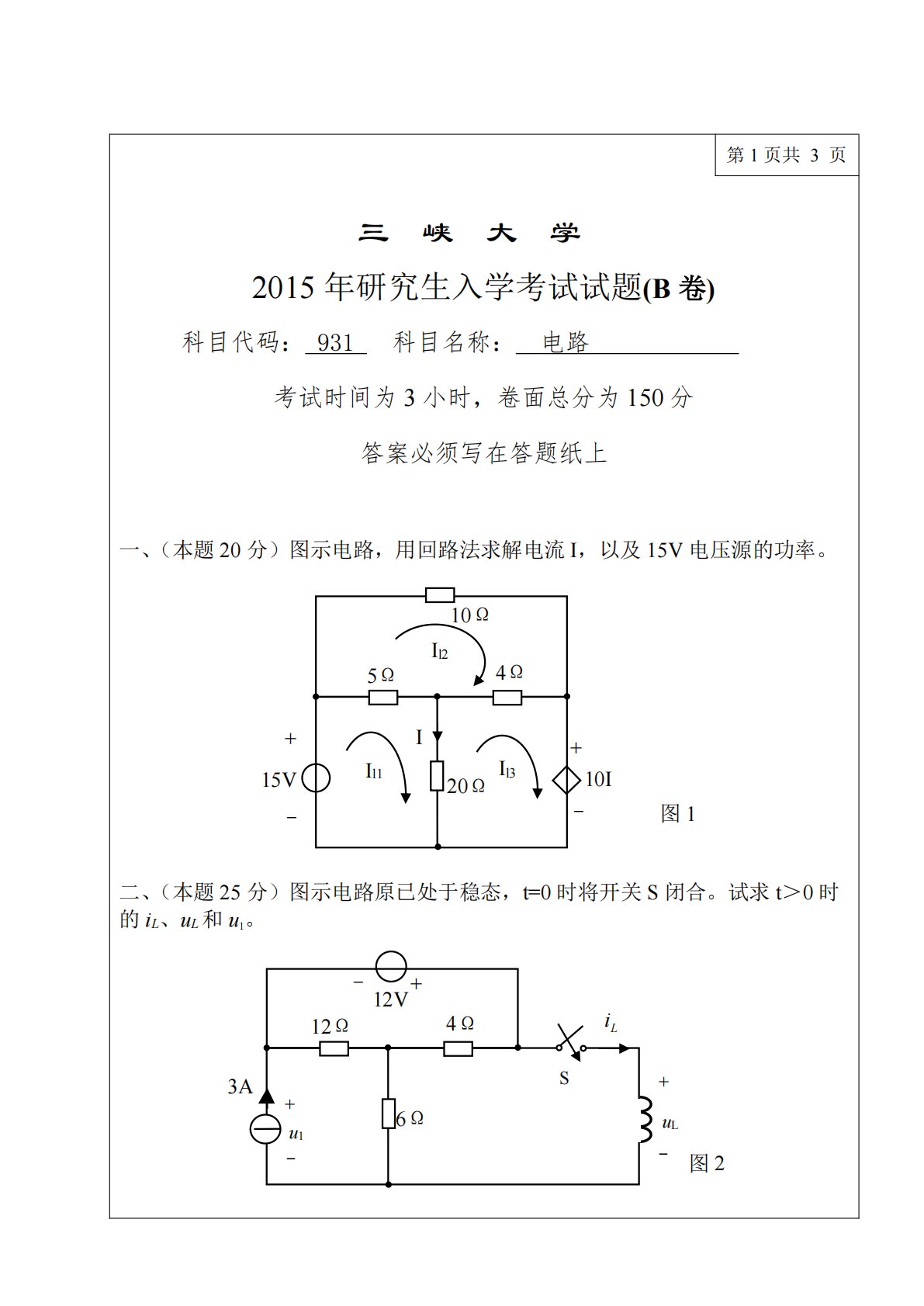 三峡大学831电路2015年真题1