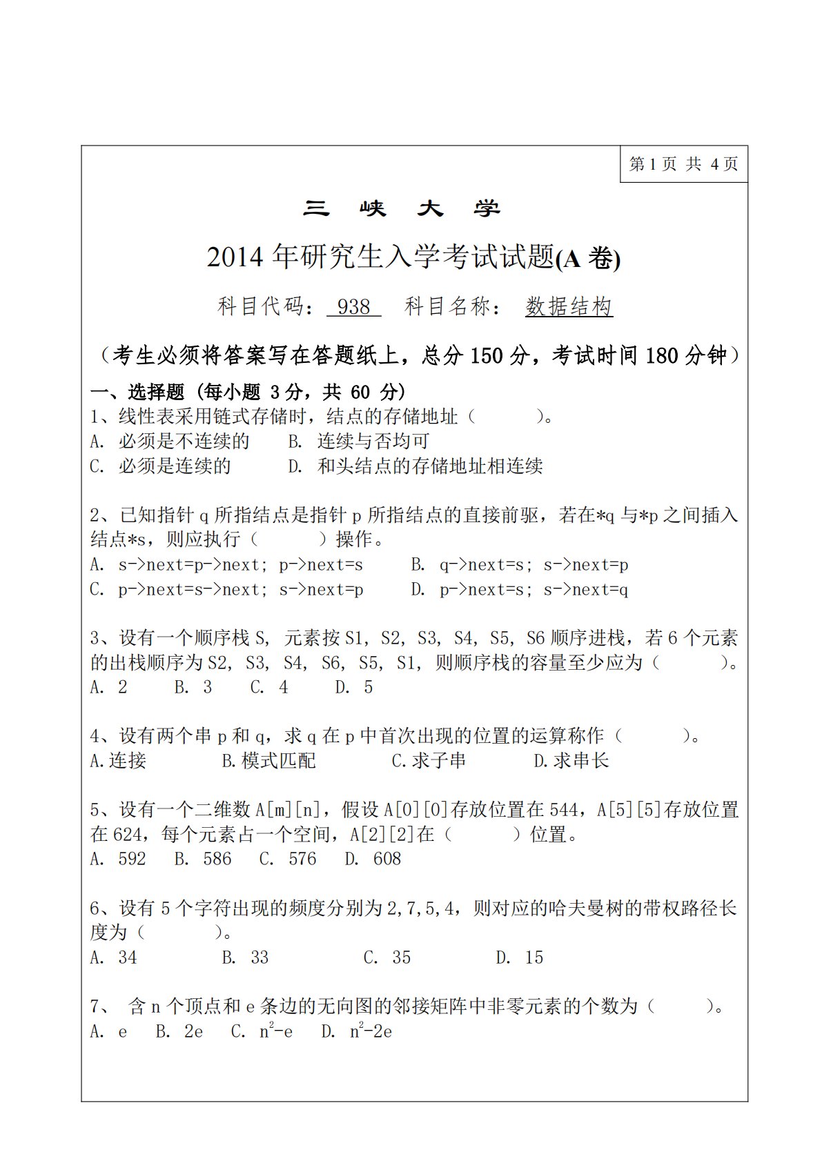 第1页共4页三峡大学2014年研究生入学考试试题(A卷)科目代码:938科目名称:数据结构(考生必须将答案写在答题纸上,总分150分,考试时间180分钟)一、选择题(每小题3分,共60分)1、线性表采用链式存储时,结点的存储地址()。A.必须是不连续的C.必须是连续的B.连续与否均可D.和头结点的存储地址相连续2、已知指针q所指结点是指针p所指结点的直接前驱,若在*q与*p之间插入结点*s,则应执行()操作。A.s->next=p->next;p->next=sC.p->next=s->next;s->next=pB.q->next=s;s->next=pD.p->next=s;s->next...