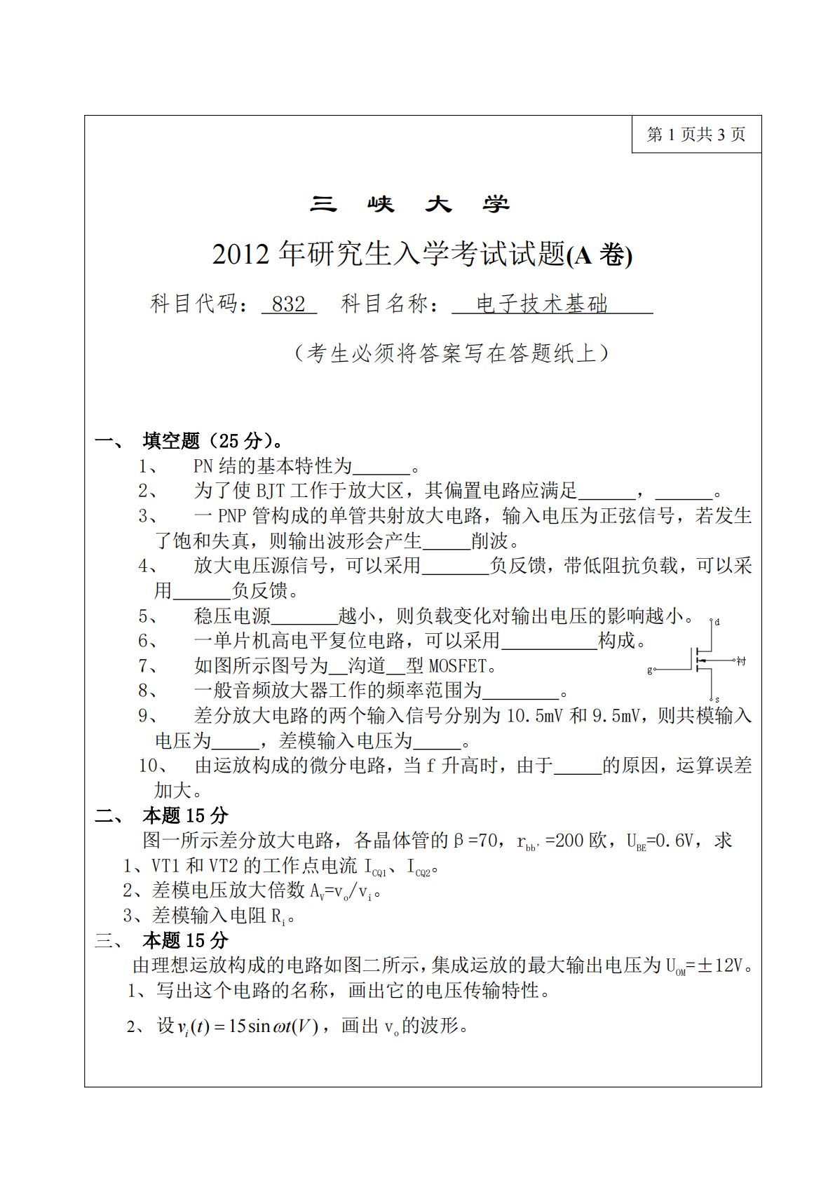 第1页共3页三峡大学2012年研究生入学考试试题(A卷)科目代码:832科目名称:电子技术基础(考生必须将答案写在答题纸上)一、填空题(25分)。PN结的基本特性为。为了使BJT工作于放大区,其偏置电路应满足,。1、2、3、一PNP管构成的单管共射放大电路,输入电压为正弦信号,若发生了饱和失真,则输出波形会产生削波。4、放大电压源信号,可以采用负反馈,带低阻抗负载,可以采负反馈。稳压电源越小,则负载变化对输出电压的影响越小。一单片机高电平复位电路,可以采用构成。如图所示图号为沟道型MOSFET。一般音频放大器工作的频率范围为。用5、6、7、8、9、差分放大电路的两个输入信号分别为10.5mV和...