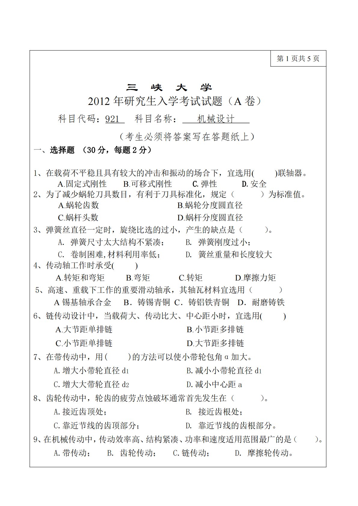 第1页共5页三峡大学2012年研究生入学考试试题(A卷)科目代码:921科目名称:机械设计(考生必须将答案写在答题纸上)一、选择题(30分,每题2分)1、在载荷不平稳且具有较大的冲击和振动的场合下,宜选用()联轴器。A.固定式刚性B.可移式刚性C.弹性D.安全2、为了减少蜗轮刀具数目,有利于刀具标准化,规定()为标准值。A.蜗轮齿数C.蜗杆头数B.蜗轮分度圆直径D.蜗杆分度圆直径3、弹簧丝直径一定时,旋绕比选的过小,产生的缺点是()。A.弹簧尺寸太大结构不紧凑;C.卷制困难,材料利用率低;B.弹簧刚度过小;D.簧丝重量和长度较大4、传动轴工作时承受(A.转矩和弯矩)B.弯矩C.转矩D.摩擦力矩...