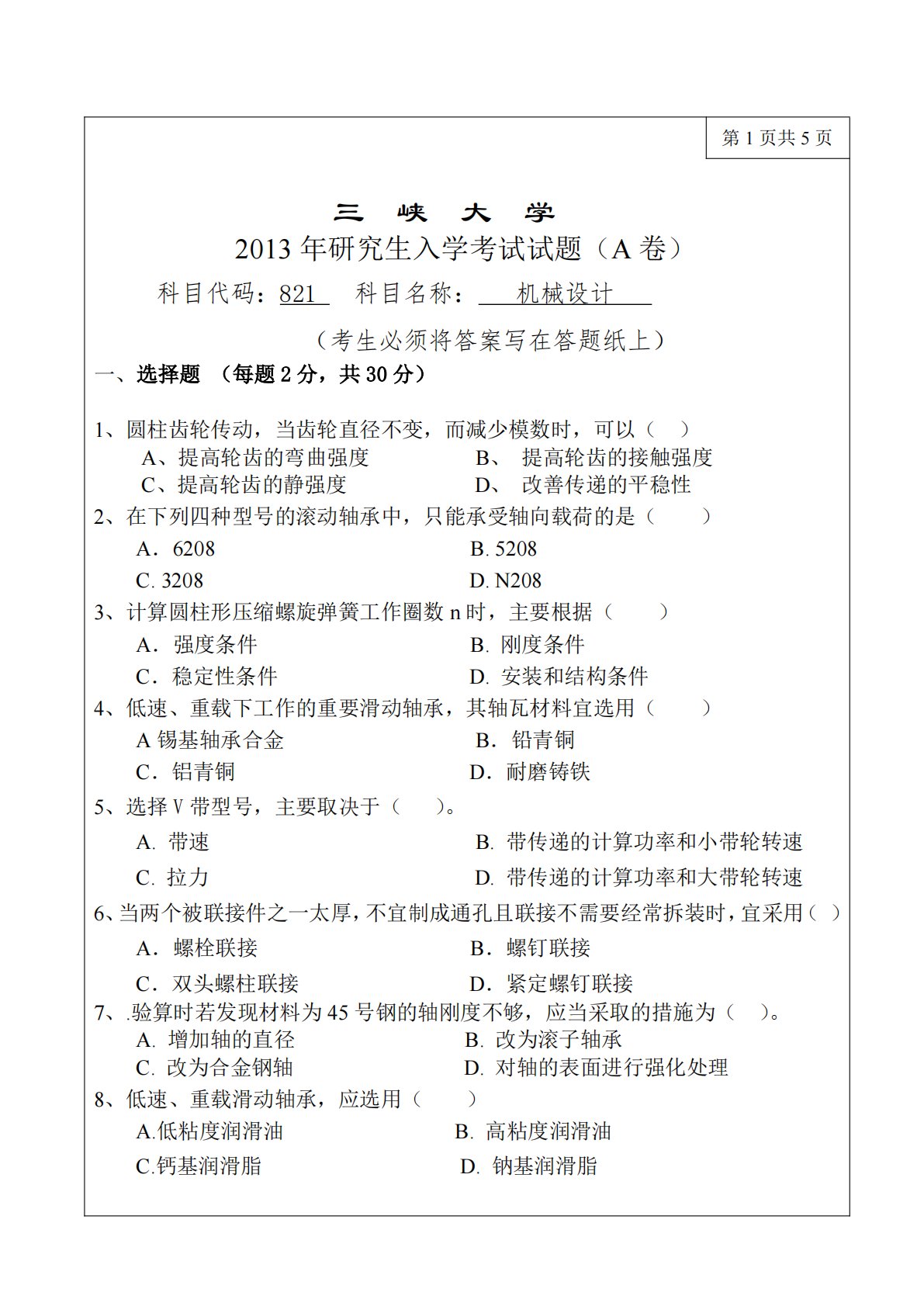 第1页共5页三峡大学2013年研究生入学考试试题(A卷)科目代码:821科目名称:机械设计(考生必须将答案写在答题纸上)一、选择题(每题2分,共30分)1、圆柱齿轮传动,当齿轮直径不变,而减少模数时,可以()A、提高轮齿的弯曲强度C、提高轮齿的静强度B、提高轮齿的接触强度D、改善传递的平稳性2、在下列四种型号的滚动轴承中,只能承受轴向载荷的是()A.6208C.3208B.5208D.N2083、计算圆柱形压缩螺旋弹簧工作圈数n时,主要根据()A.强度条件C.稳定性条件B.刚度条件D.安装和结构条件4、低速、重载下工作的重要滑动轴承,其轴瓦材料宜选用()B.铅青铜D.耐磨铸铁A锡基轴承合金C....