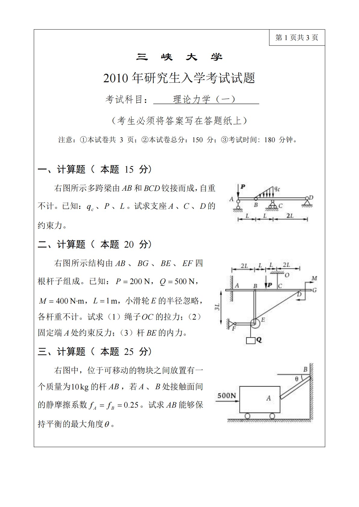 第1页共3页三峡大学2010年研究生入学考试试题考试科目:理论力学(一)(考生必须将答案写在答题纸上)注意:①本试卷共3页;②本试卷总分:150分;③考试时间:180分钟。一、计算题(本题15分)右图所示多跨梁由AB和BCD铰接而成,自重不计。已知:cq、P、L。试求支座A、C、D的约束力。二、计算题(本题20分)右图所示结构由AB、BG、BE、EF四根杆子组成。已知:200PN,500QN,400MNm,1Lm,小滑轮E的半径忽略,各杆重不计。试求(1)绳子OC的拉力;(2)固定端A处约束反力;(3)杆BE的内力。三、计算题(本题25分)右图中,位于可移动的物块之间放置有一个质量为...