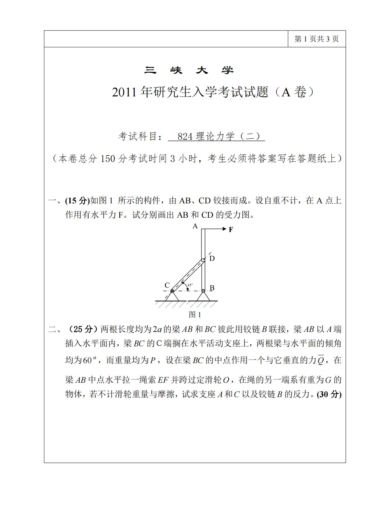 三峡大学理论力学2011年真题