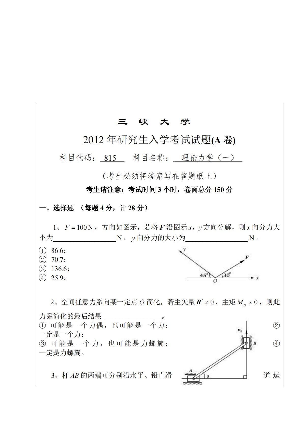 三峡大学2012年研究生入学考试试题(A卷)科目代码:815科目名称:理论力学(一)(考生必须将答案写在答题纸上)考生请注意:考试时间3小时,卷面总分150分一、选择题(每题4分,计28分)1、N100F,方向如图示,若将F沿图示yx,方向分解,则x向分力大小为__________________N,y向分力的大小为__________________N。186.6;270.7;3136.6;425.9。2、空间任意力系向某一定点O简化,若主矢量0R,主矩0oM,则此力系简化的最后结果_________________。①可能是一个力偶,也可能是一个力;②一定是一个力;③可能是一个力,...