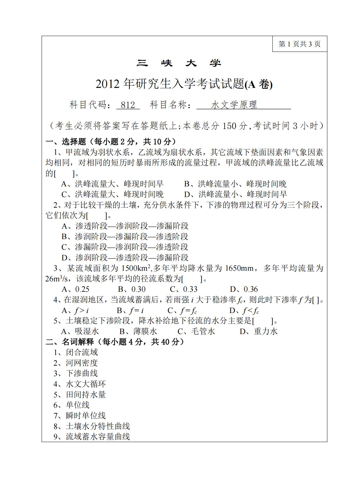 第1页共3页三峡大学2012年研究生入学考试试题(A卷)科目代码:812科目名称:水文学原理(考生必须将答案写在答题纸上;本卷总分150分,考试时间3小时)一、选择题(每小题2分,共10分)1、甲流域为羽状水系,乙流域为扇状水系,其它流域下垫面因素和气象因素均相同,对相同的短历时暴雨所形成的流量过程,甲流域的洪峰流量比乙流域的[]。A、洪峰流量大、峰现时间早B、洪峰流量小、峰现时间晚C、洪峰流量大、峰现时间晚D、洪峰流量小、峰现时间早2、对于比较干燥的土壤,充分供水条件下,下渗的物理过程可分为三个阶段,它们依次为[]。A、渗透阶段—渗润阶段—渗漏阶段B、渗润阶段—渗漏阶段—渗透阶段C、渗漏阶段...