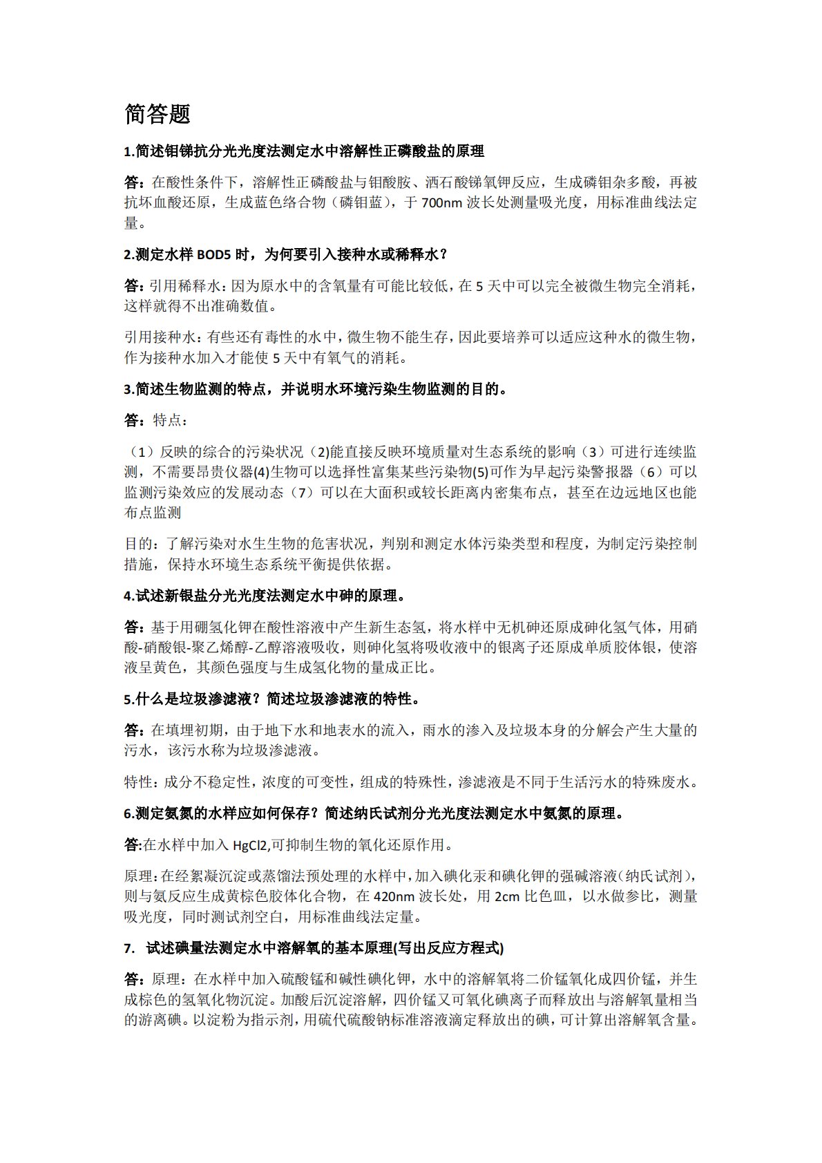 简答题1.简述钼锑抗分光光度法测定水中溶解性正磷酸盐的原理答:在酸性条件下,溶解性正磷酸盐与钼酸胺、洒石酸锑氧钾反应,生成磷钼杂多酸,再被抗坏血酸还原,生成蓝色络合物(磷钼蓝),于700nm波长处测量吸光度,用标准曲线法定量。2.测定水样BOD5时,为何要引入接种水或稀释水?答:引用稀释水:因为原水中的含氧量有可能比较低,在5天中可以完全被微生物完全消耗,这样就得不出准确数值。引用接种水:有些还有毒性的水中,微生物不能生存,因此要培养可以适应这种水的微生物,作为接种水加入才能使5天中有氧气的消耗。3.简述生物监测的特点,并说明水环境污染生物监测的目的。答:特点:(1)反映的综合的污染状况(2)...