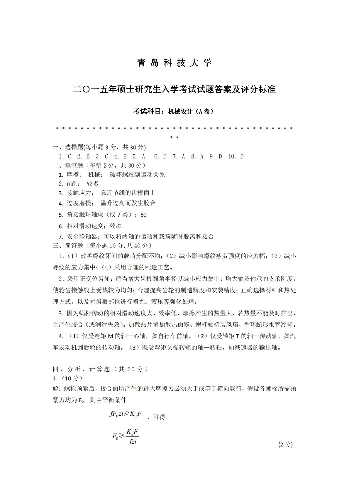 青岛科技大学二○一五年硕士研究生入学考试试题答案及评分标准考试科目:机械设计(A卷)﹡﹡﹡﹡﹡﹡﹡﹡﹡﹡﹡﹡﹡﹡﹡﹡﹡﹡﹡﹡﹡﹡﹡﹡﹡﹡﹡﹡﹡﹡﹡﹡﹡﹡﹡﹡﹡﹡﹡﹡﹡一、选择题(每小题3分,共30分)1.C2.B3.C4.B5.A6.D7.A8.A9.D10.D二、填空题(每空2分,共30分)1.摩擦;机械;破坏螺纹副运动关系2.节距;较多3.接触应力;靠近节线的齿根面上4.过度磨损;温升过高而发生胶合5.角接触球轴承(或7类);606.相对滑动速度;效率7.安全联轴器;可以将两轴的运动和载荷随时脱离和接合三、简答题(每小题10分,共40分)1.(1)改善螺纹牙间的载荷分配不均;(2)减小影响...
