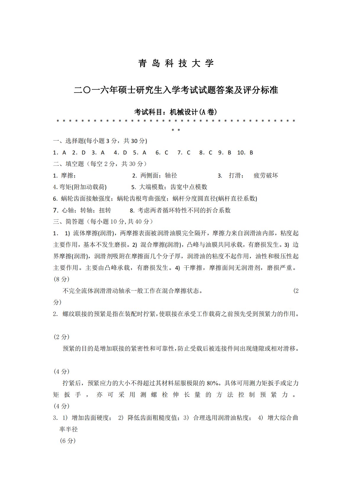 青岛科技大学二○一六年硕士研究生入学考试试题答案及评分标准考试科目:机械设计(A卷)﹡﹡﹡﹡﹡﹡﹡﹡﹡﹡﹡﹡﹡﹡﹡﹡﹡﹡﹡﹡﹡﹡﹡﹡﹡﹡﹡﹡﹡﹡﹡﹡﹡﹡﹡﹡﹡﹡﹡﹡﹡一、选择题(每小题3分,共30分)1.A2.D3.A4.D5.A6.C7.C8.C9.B10.B二、填空题(每空2分,共30分)1.摩擦;2.两侧面;轴径3.打滑;疲劳破坏4.弯矩(附加动载荷)5.大端模数;齿宽中点模数6.蜗轮齿面接触强度;蜗轮齿根弯曲强度;蜗杆分度圆直径(蜗杆直径系数)7.心轴;转轴;扭转8.考虑两者循环特性不同的折合系数三、简答题(每小题10分,共40分)1.1)流体摩擦(润滑),两摩擦表面被润滑油膜完全隔开...