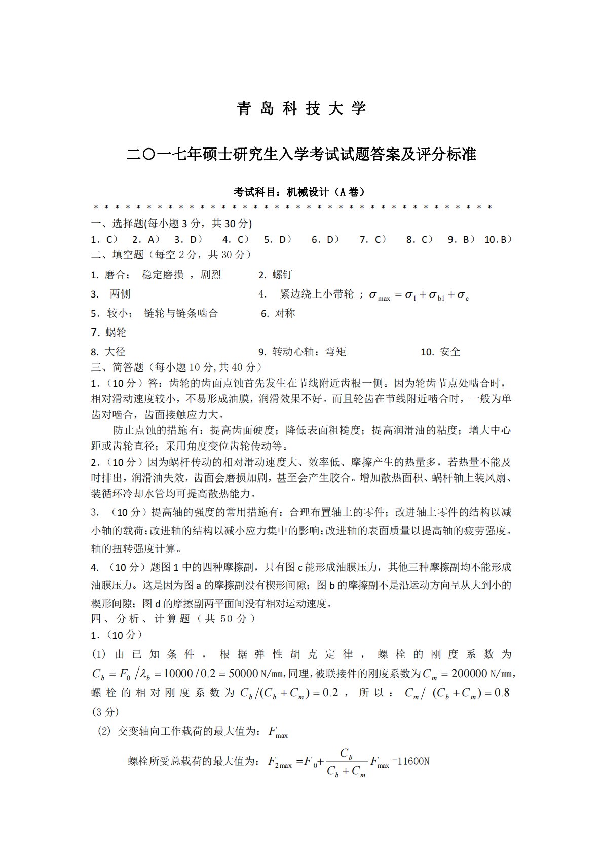 青岛科技大学二○一七年硕士研究生入学考试试题答案及评分标准考试科目:机械设计(A卷)﹡﹡﹡﹡﹡﹡﹡﹡﹡﹡﹡﹡﹡﹡﹡﹡﹡﹡﹡﹡﹡﹡﹡﹡﹡﹡﹡﹡﹡﹡﹡﹡﹡﹡﹡﹡﹡﹡一、选择题(每小题3分,共30分)1.C)2.A)3.D)4.C)5.D)6.D)7.C)8.C)9.B)10.B)二、填空题(每空2分,共30分)1.磨合;稳定磨损,剧烈2.螺钉3.两侧4.紧边绕上小带轮;cb11max5.较小;链轮与链条啮合6.对称7.蜗轮8.大径9.转动心轴;弯矩10.安全三、简答题(每小题10分,共40分)1.(10分)答:齿轮的齿面点蚀首先发生在节线附近齿根一侧。因为轮齿节点处啮合时,相对滑动速...