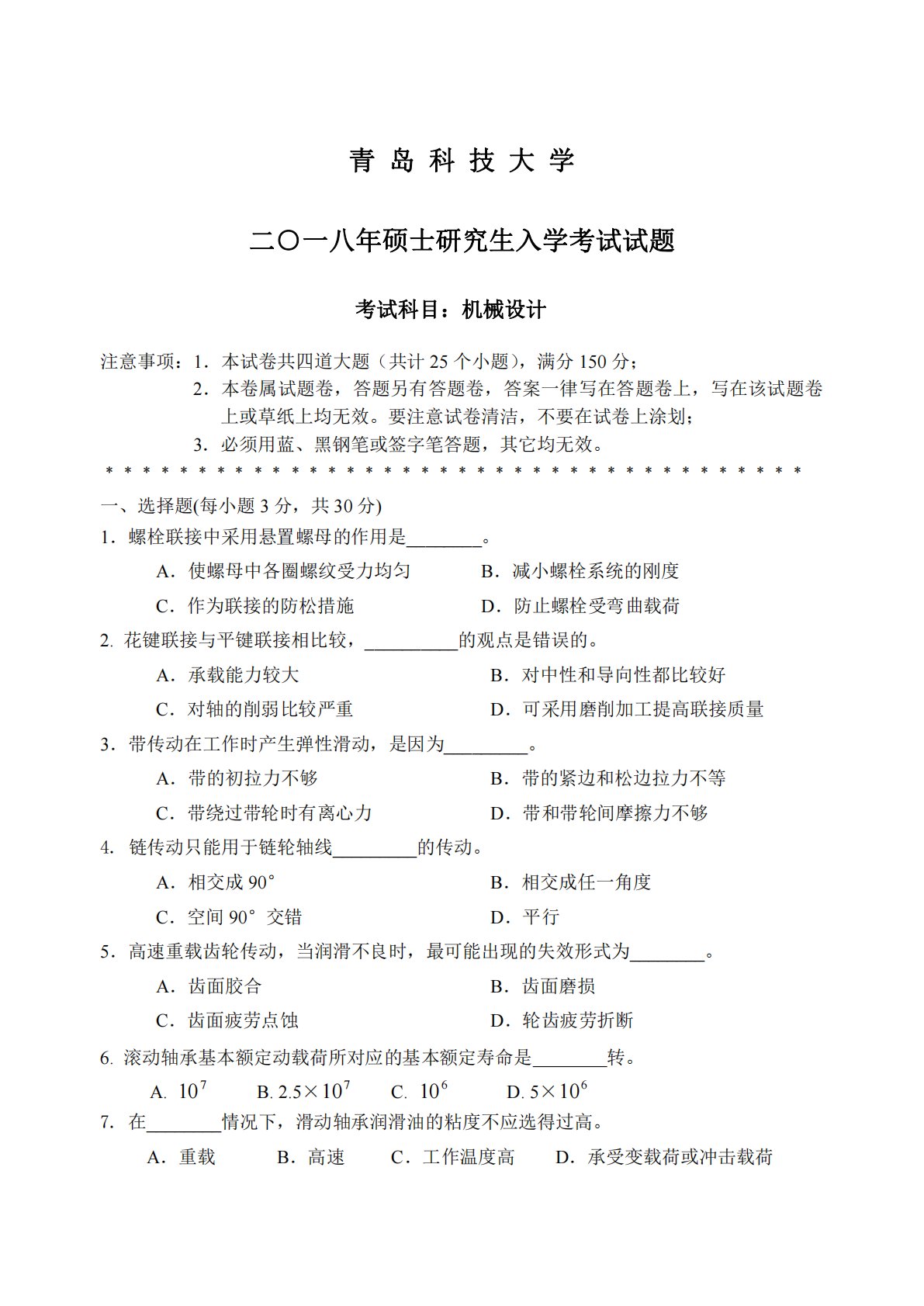 青岛科技大学二○一八年硕士研究生入学考试试题考试科目:机械设计注意事项:1.本试卷共四道大题(共计25个小题),满分150分;2.本卷属试题卷,答题另有答题卷,答案一律写在答题卷上,写在该试题卷上或草纸上均无效。要注意试卷清洁,不要在试卷上涂划;3.必须用蓝、黑钢笔或签字笔答题,其它均无效。﹡﹡﹡﹡﹡﹡﹡﹡﹡﹡﹡﹡﹡﹡﹡﹡﹡﹡﹡﹡﹡﹡﹡﹡﹡﹡﹡﹡﹡﹡﹡﹡﹡﹡﹡﹡﹡﹡一、选择题(每小题3分,共30分)1.螺栓联接中采用悬置螺母的作用是________。A.使螺母中各圈螺纹受力均匀B.减小螺栓系统的刚度C.作为联接的防松措施D.防止螺栓受弯曲载荷2.花键联接与平键联接相比较,__________的...