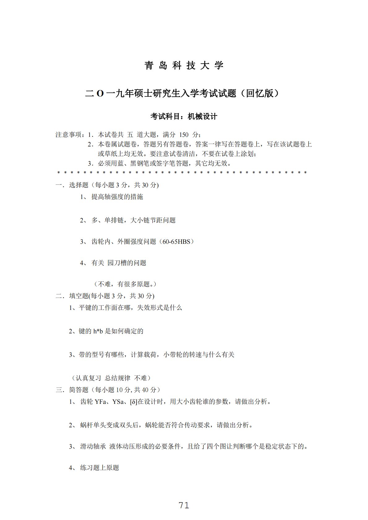 青岛科技大学二O一九年硕士研究生入学考试试题(回忆版)考试科目:机械设计注意事项:1.本试卷共五道大题,满分150分;2.本卷属试题卷,答题另有答题卷,答案一律写在答题卷上,写在该试题卷上或草纸上均无效。要注意试卷清洁,不要在试卷上涂划;3.必须用蓝、黑钢笔或签字笔答题,其它均无效。﹡﹡﹡﹡﹡﹡﹡﹡﹡﹡﹡﹡﹡﹡﹡﹡﹡﹡﹡﹡﹡﹡﹡﹡﹡﹡﹡﹡﹡﹡﹡﹡﹡﹡﹡﹡﹡﹡﹡一.选择题(每小题3分,共30分)1、提高轴强度的措施2、多、单排链,大小链节距问题3、齿轮内、外圈强度问题(60-65HBS)4、有关园刀槽的问题(不难,有很多原题。)二.填空题(每小题3分,共30分)1、平键的工作面在哪,失效形式是什...