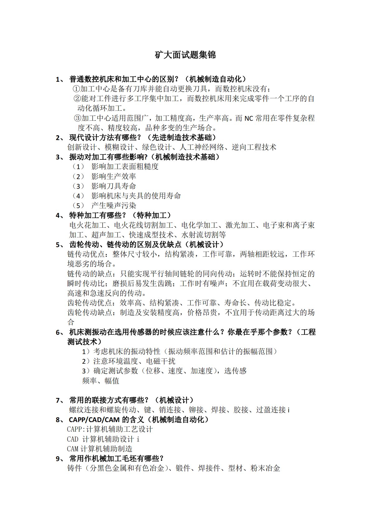 矿大面试题集锦1、普通数控机床和加工中心的区别?(机械制造自动化)①加工中心是备有刀库并能自动更换刀具,而数控机床没有;②能对工件进行多工序集中加工,而数控机床用来完成零件一个工序的自动化循环加工。③加工中心适用范围广,加工精度高,生产率高。而NC常用在零件复杂程度不高、精度较高,品种多变的生产场合。2、现代设计方法有哪些?(先进制造技术基础)创新设计、模糊设计、绿色设计、人工神经网络、逆向工程技术3、振动对加工有哪些影响?(机械制造技术基础)(1)影响加工表面粗糙度(2)影响生产效率(3)影响刀具寿命(4)影响机床与夹具的使用寿命(5)产生噪声污染4、特种加工有哪些?(特种加工)电火花加工、...