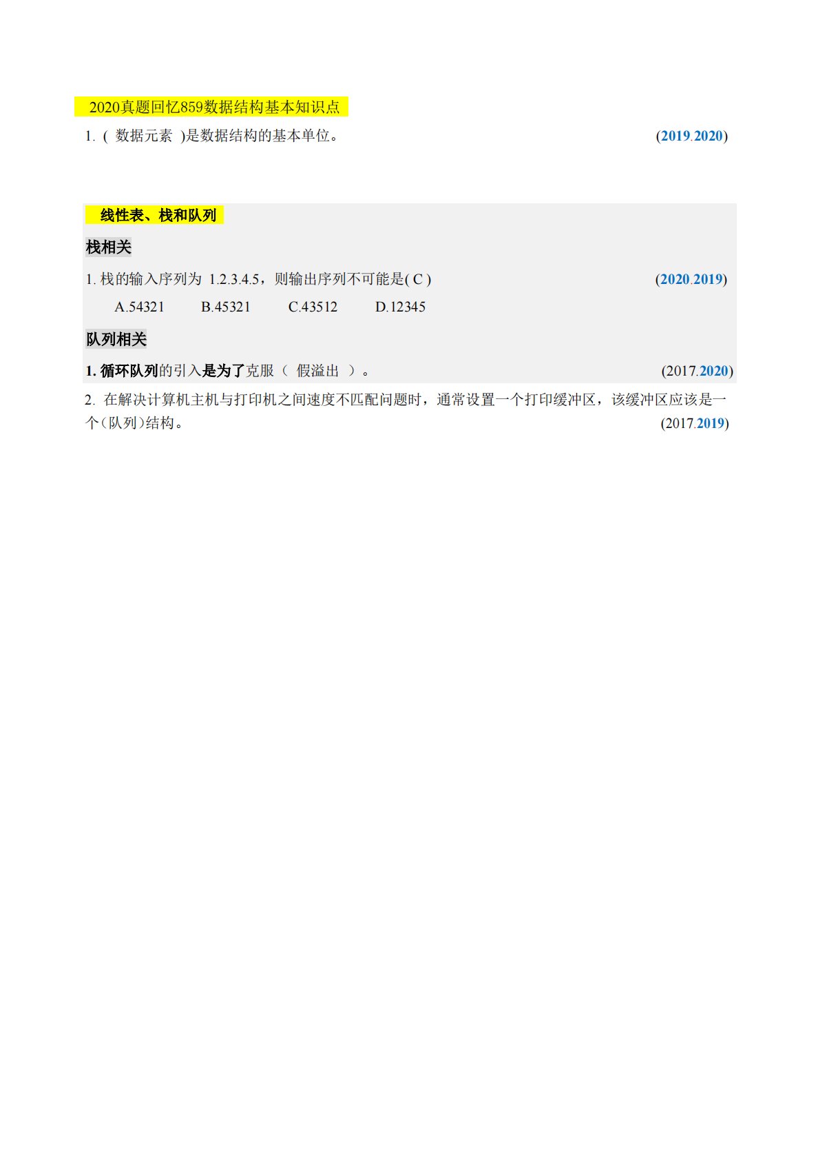 2020真题回忆859数据结构基本知识点1.(数据元素)是数据结构的基本单位。(2019.2020)线性表、栈和队列栈相关1.栈的输入序列为1.2.3.4.5,则输出序列不可能是(C)A.54321B.45321C.43512D.12345(2020.2019)队列相关1.循环队列的引入是为了克服(假溢出)。(2017.2020)2.在解决计算机主机与打印机之间速度不匹配问题时,通常设置一个打印缓冲区,该缓冲区应该是一个(队列)结构。(2017.2019)已知关键字{,,,},构造哈夫曼树并求带权路径长度。(2020)矩阵1.对称矩阵,下三角存储,A[0][0]地址为d每个元素占1个地址空间,...