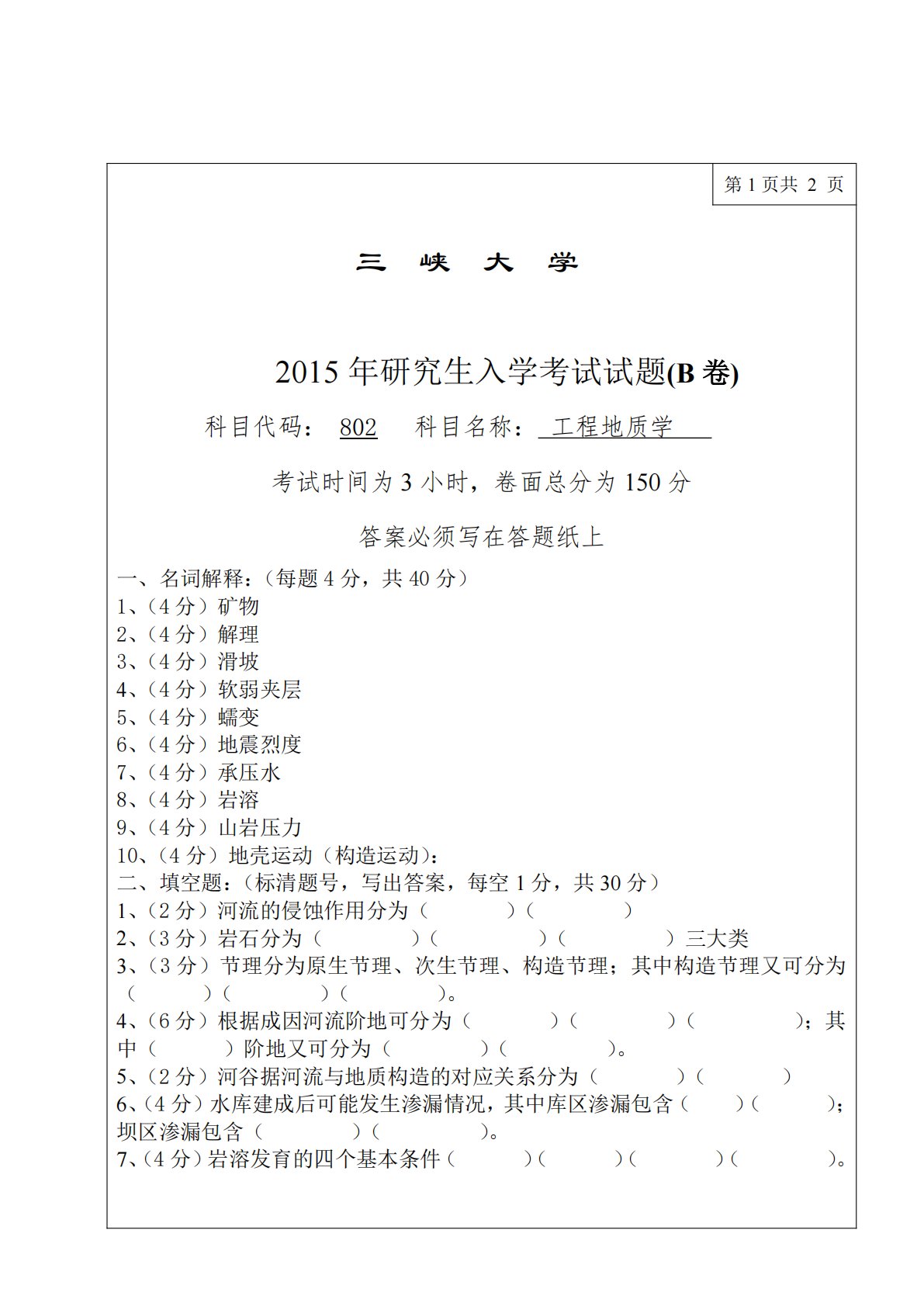 第1页共2页三峡大学2015年研究生入学考试试题(B卷)科目代码:802科目名称:工程地质学考试时间为3小时,卷面总分为150分答案必须写在答题纸上一、名词解释:(每题4分,共40分)1、(4分)矿物2、(4分)解理3、(4分)滑坡4、(4分)软弱夹层5、(4分)蠕变6、(4分)地震烈度7、(4分)承压水8、(4分)岩溶9、(4分)山岩压力10、(4分)地壳运动(构造运动):二、填空题:(标清题号,写出答案,每空1分,共30分)1、(2分)河流的侵蚀作用分为()()2、(3分)岩石分为()()()三大类3、(3分)节理分为原生节理、次生节理、构造节理;其中构造节理又可分为()()()。4、(6...