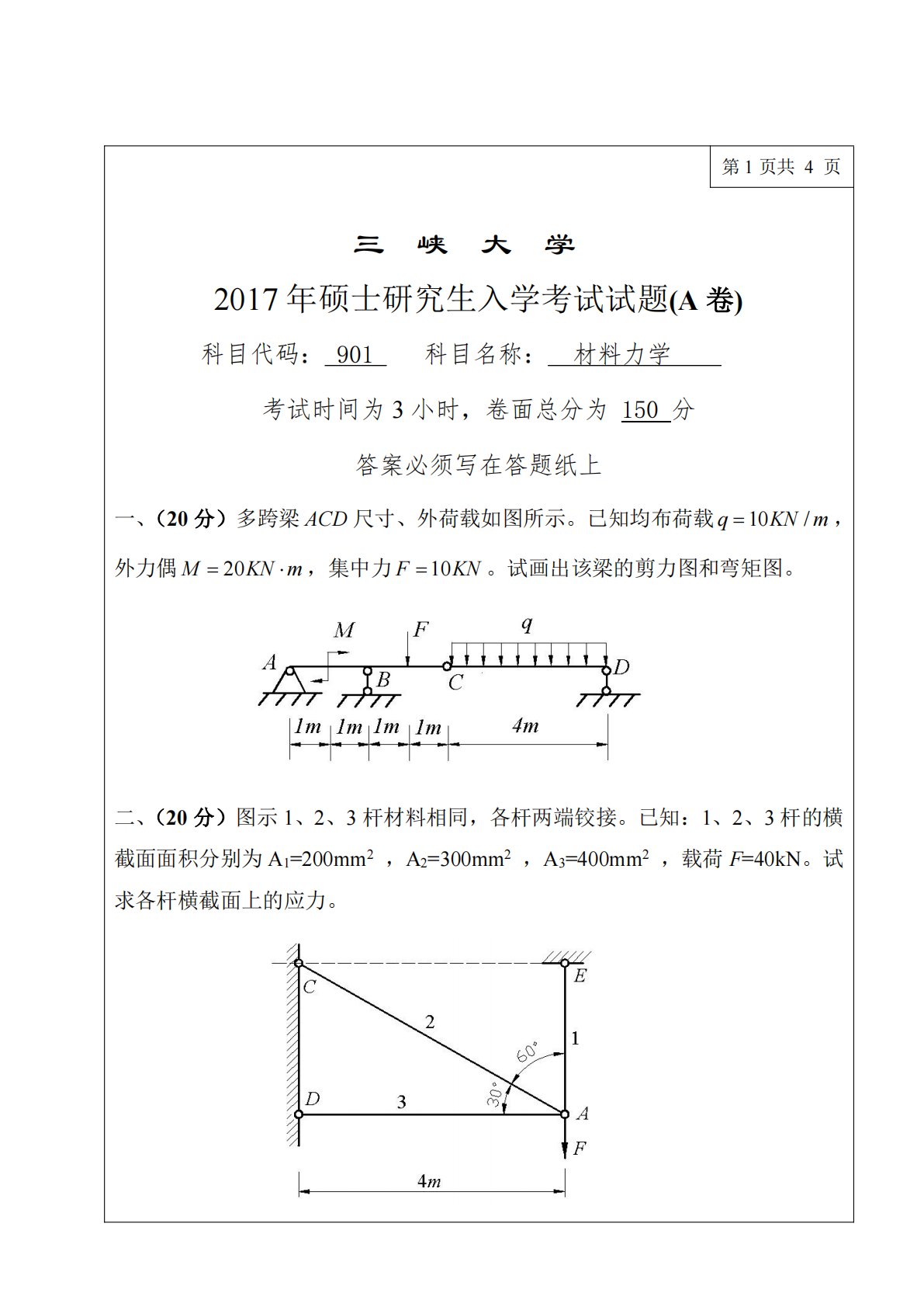 第1页共4页三峡大学2017年硕士研究生入学考试试题(A卷)科目代码:901科目名称:材料力学考试时间为3小时,卷面总分为150分答案必须写在答题纸上一、(20分)多跨梁ACD尺寸、外荷载如图所示。已知均布荷载q10KN/m,外力偶M20KNm,集中力F10KN。试画出该梁的剪力图和弯矩图。二、(20分)图示1、2、3杆材料相同,各杆两端铰接。已知:1、2、3杆的横截面面积分别为A1=200mm2,A2=300mm2,A3=400mm2,载荷F=40kN。试求各杆横截面上的应力。第2页三、(15分)图示短柱分别在1,2,3点受到垂直向下的集中力F的作用,F=60KN,短柱尺寸如图所示(...