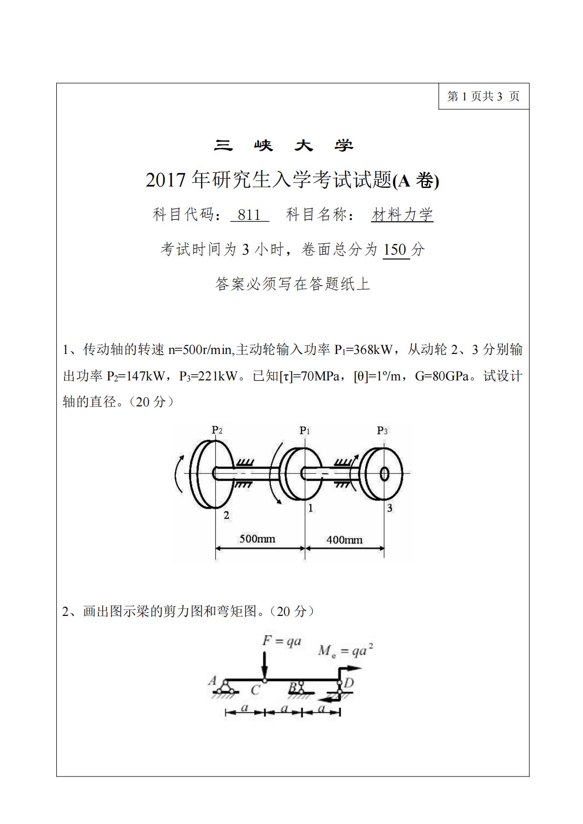 第1页共3页三峡大学2017年研究生入学考试试题(A卷)科目代码:811科目名称:材料力学考试时间为3小时,卷面总分为150分答案必须写在答题纸上1、传动轴的转速n=500r/min,主动轮输入功率P1=368kW,从动轮2、3分别输出功率P2=147kW,P3=221kW。已知[τ]=70MPa,[θ]=1º/m,G=80GPa。试设计轴的直径。(20分)2、画出图示梁的剪力图和弯矩图。(20分)第2页3、简支梁的荷载情况及尺寸如下图所示,试求梁的下边缘的总伸长。(20分)4、一矩形截面梁如图所示,已知梁总长度为4m,P=2kN,横截面的高宽比h/b=3,材料为松木,其许用应力为[σ]=8M...